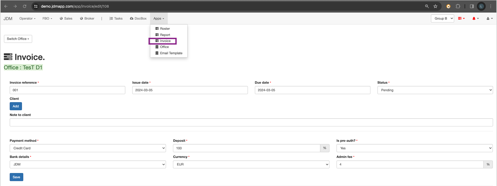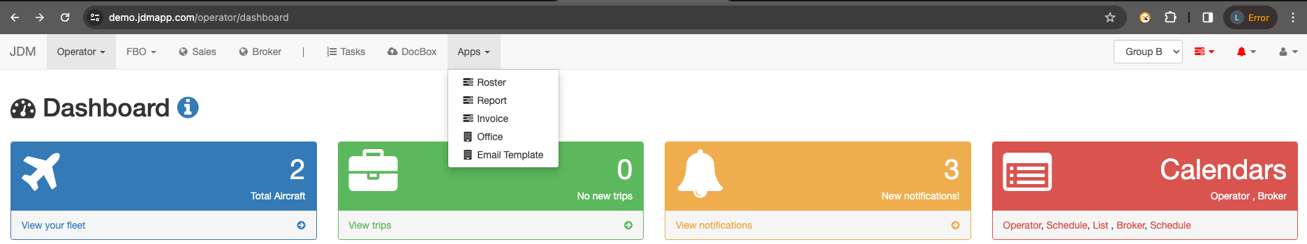 Apps module is designed to bring up all the apps under the same umbrella. Apps Module can be accessed on the main header. Apps module comes with Roster, Report, Invoice, Office and Email template sub modules.