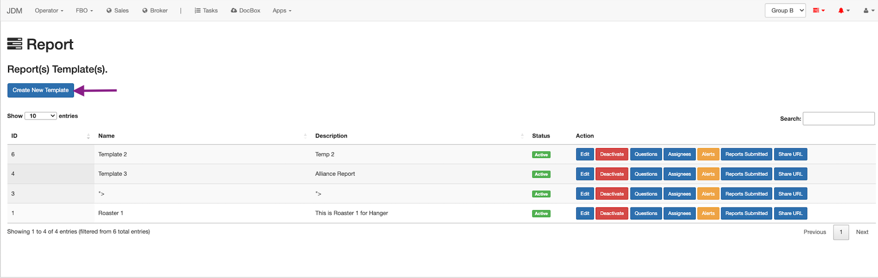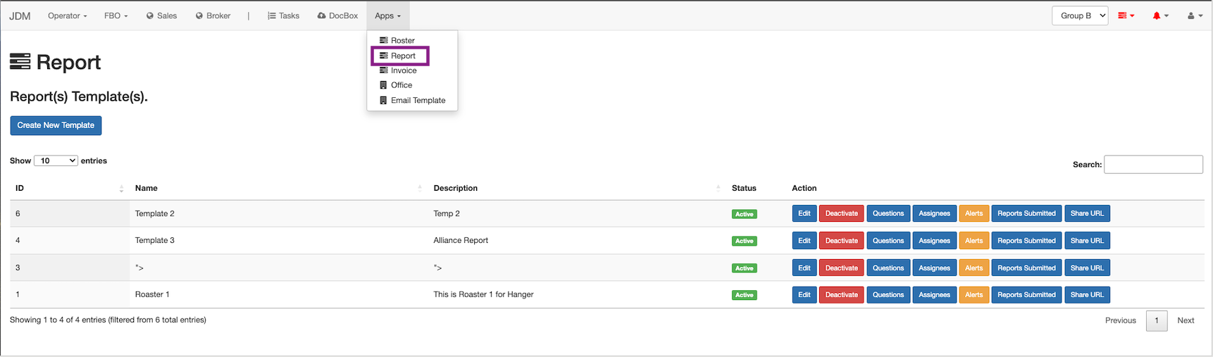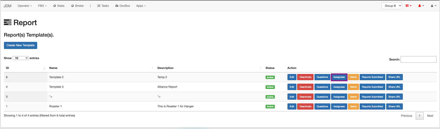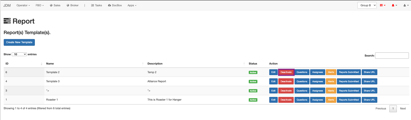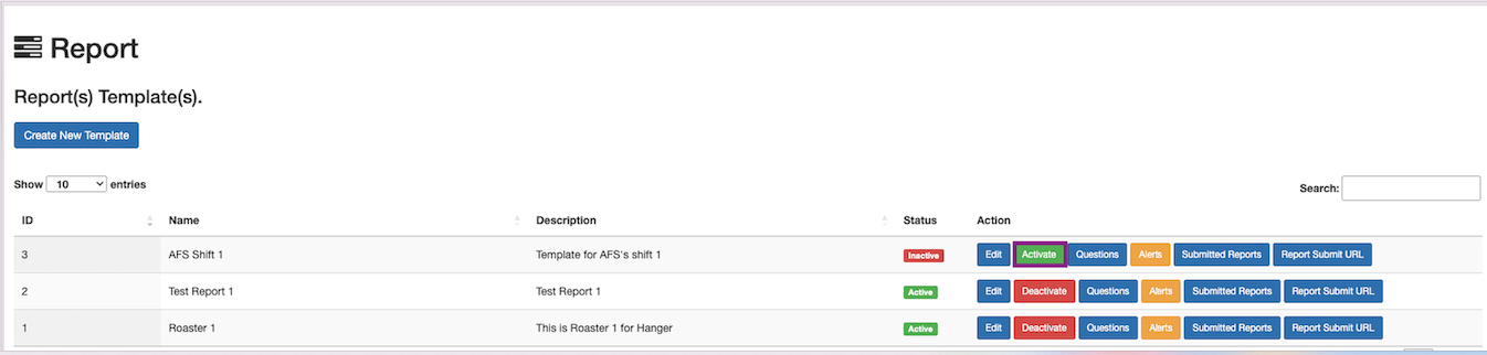 A report template can be modified by hitting on the Edit button. A report template can be temporarily or permanently disabled by clicking on the Deactivate button.