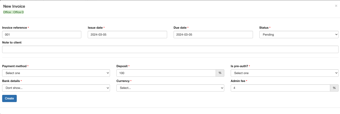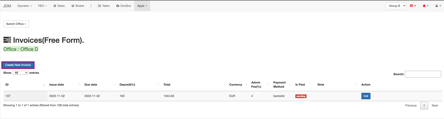 A new invoice can be created by clicking on the Create New Invoice button on the top left corner