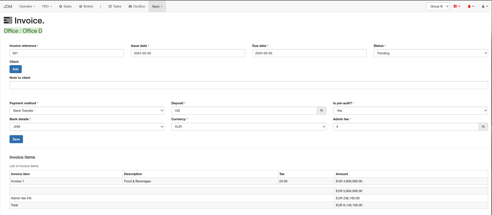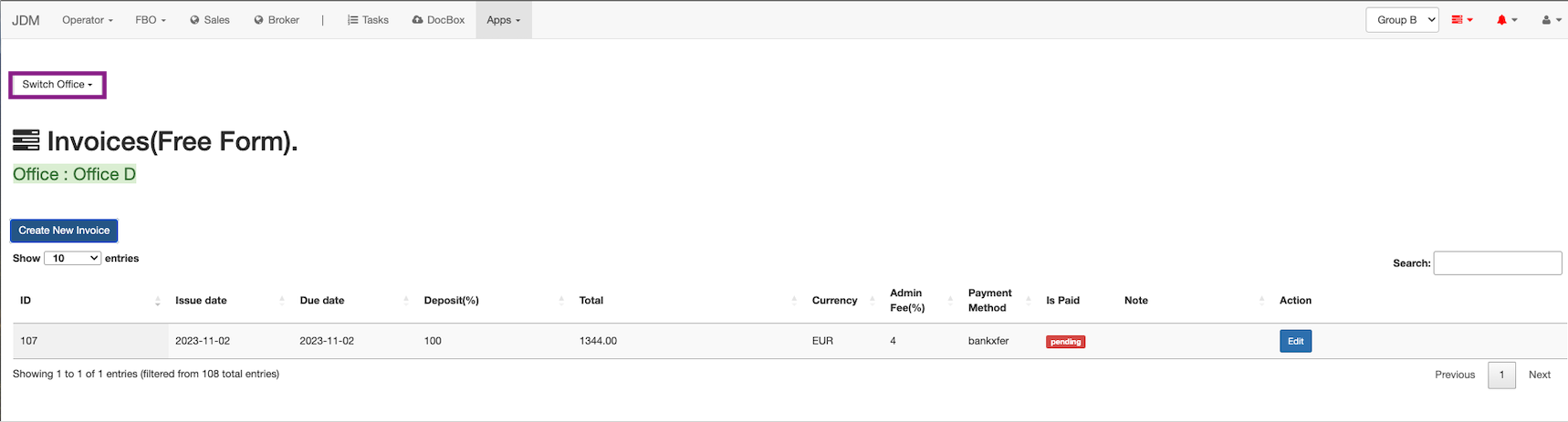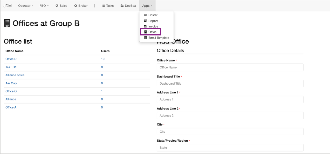 All the offices belonging to the group will be listed under Office List and a new office can be created from the Add Office section.