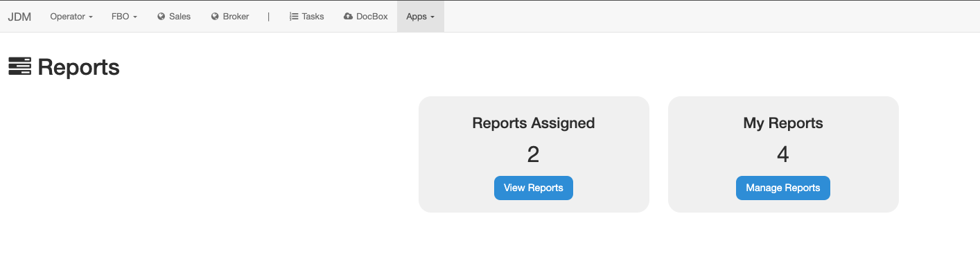 All the reports assigned to the user can be viewed on the View Reports KPI box and the reports can be managed on the Manage Reports section.