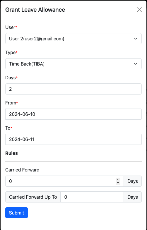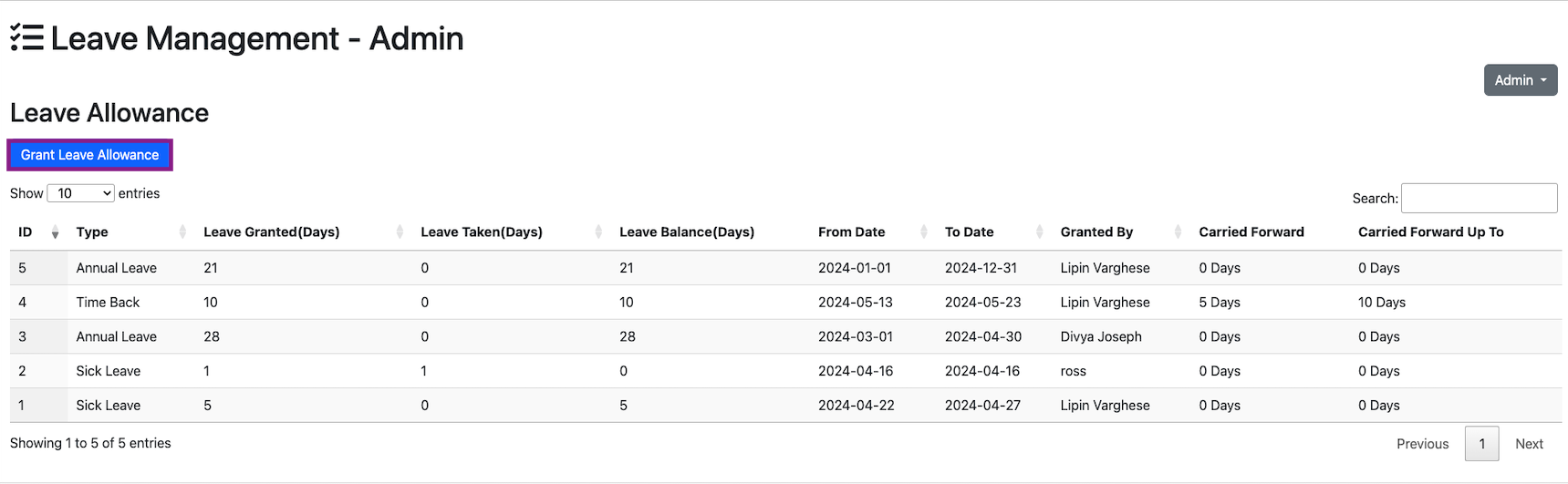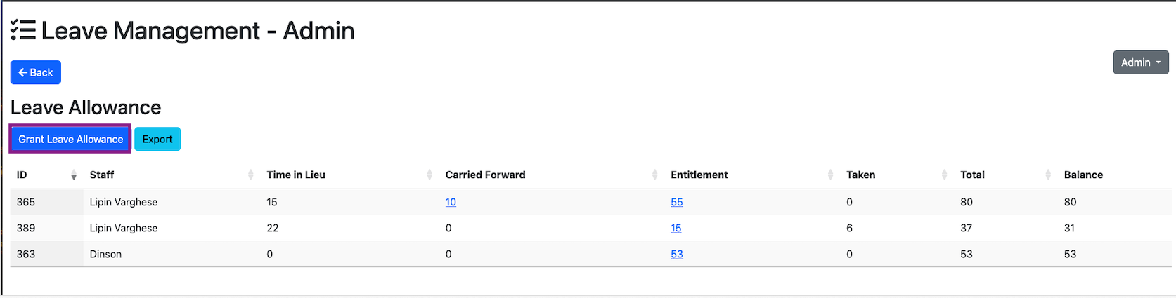 Admin can grant the leave allowance of each users by clicking on the Leave Allowance option in the admin drop down menu
