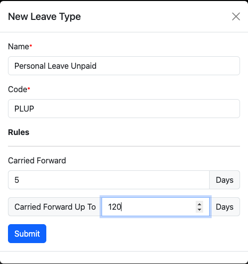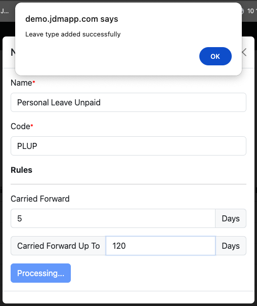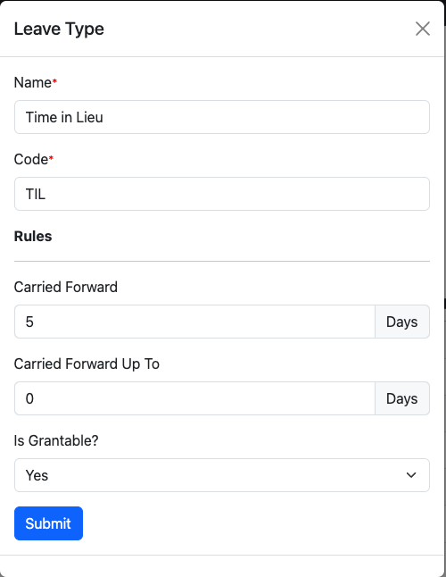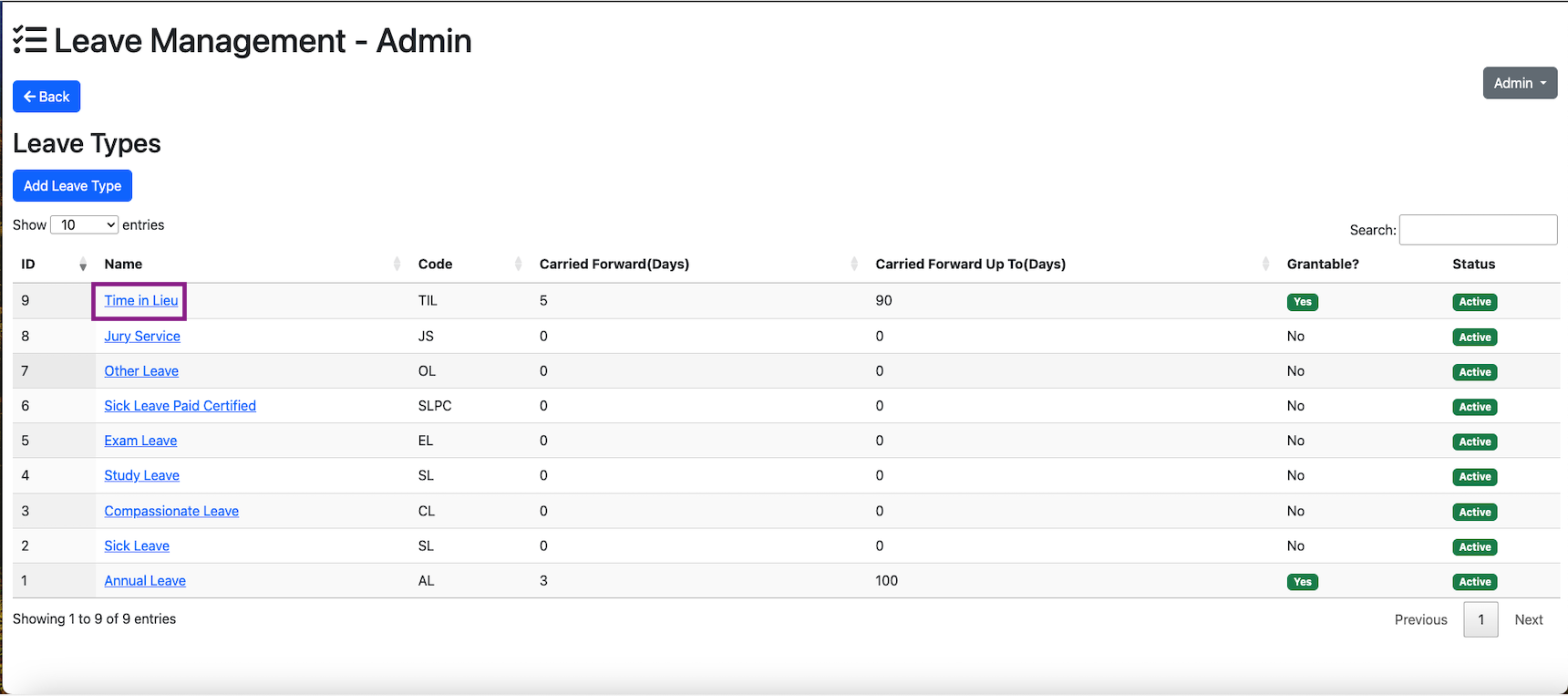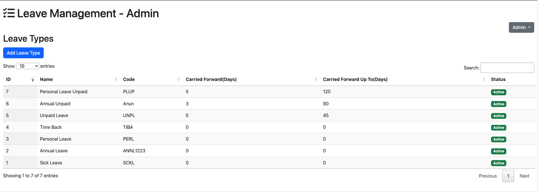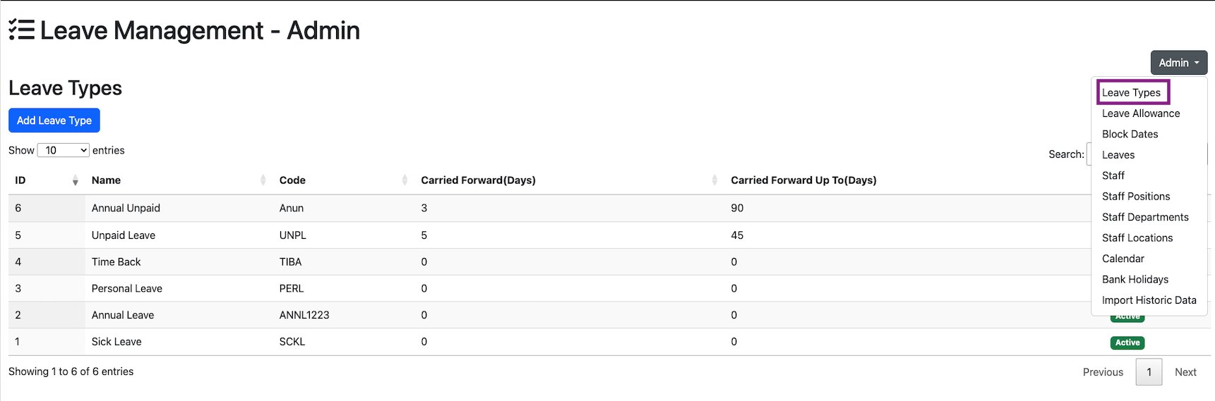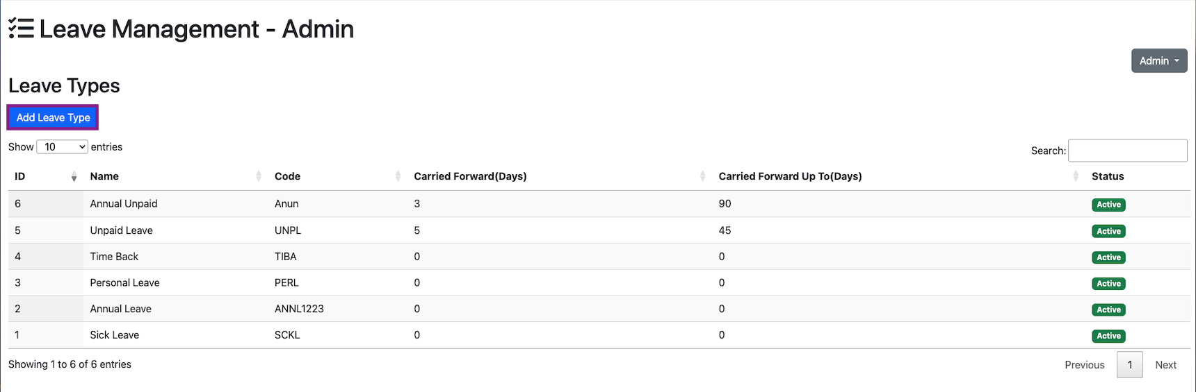 All the existing leave types are listed down on the leave types. A new leave type can be created by clicking on the Add Leave Type button on the top left most corner.