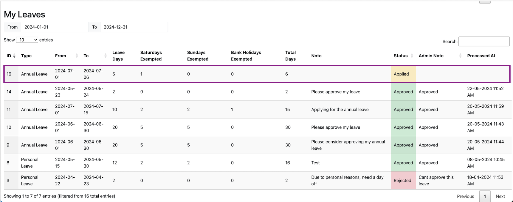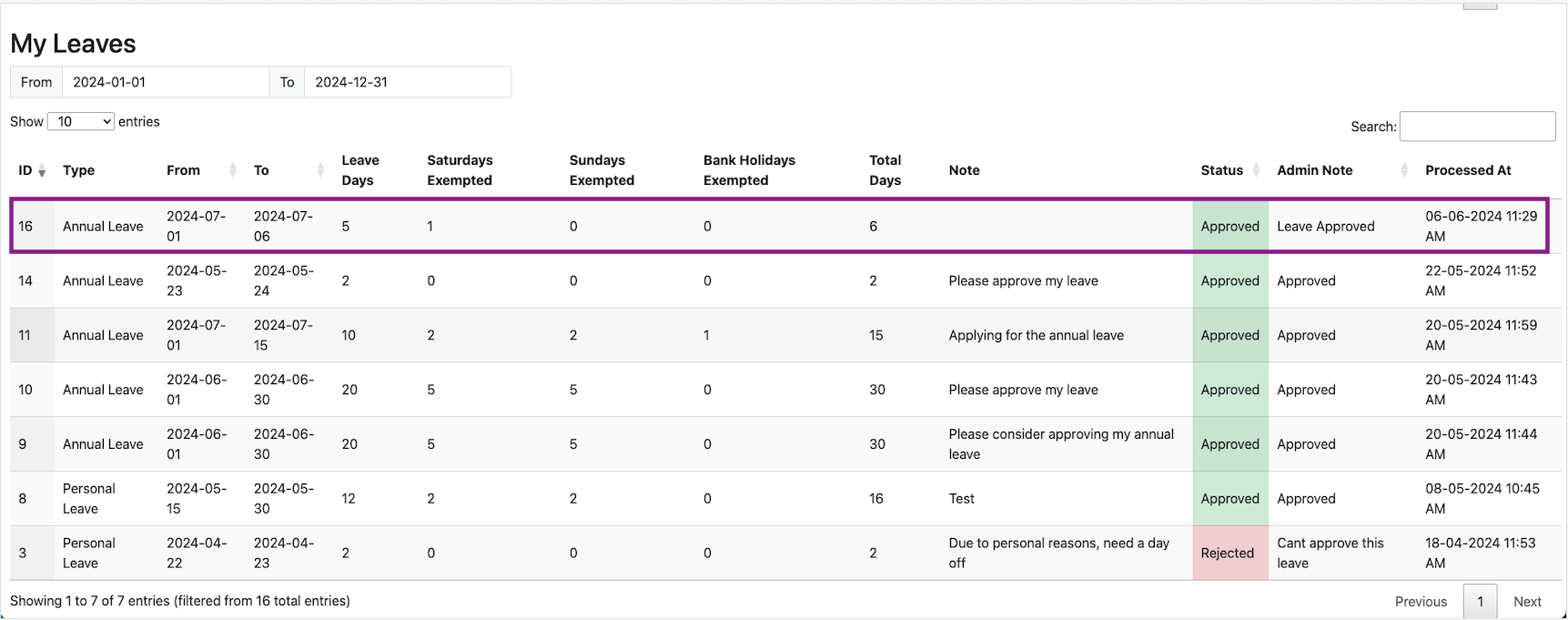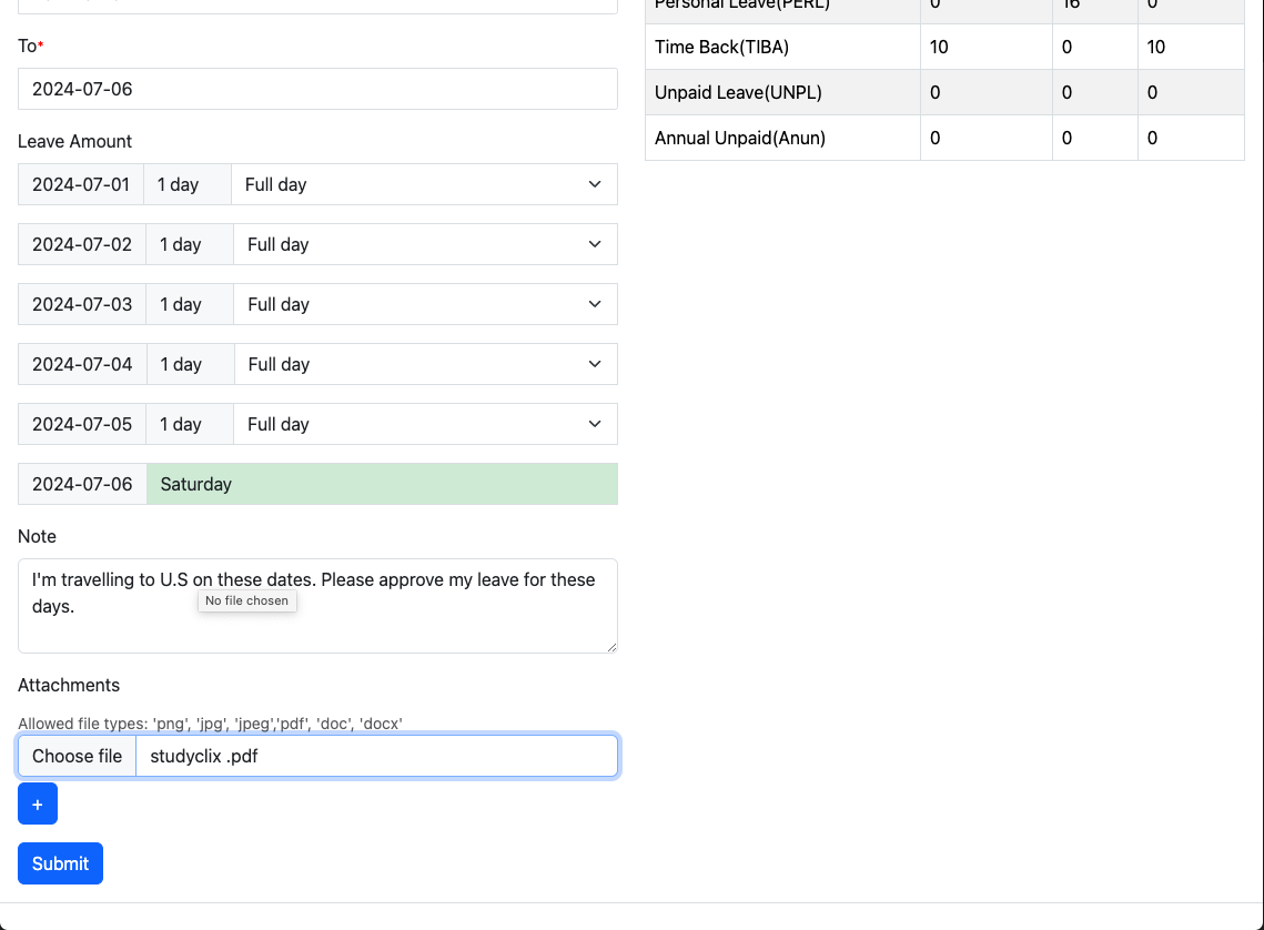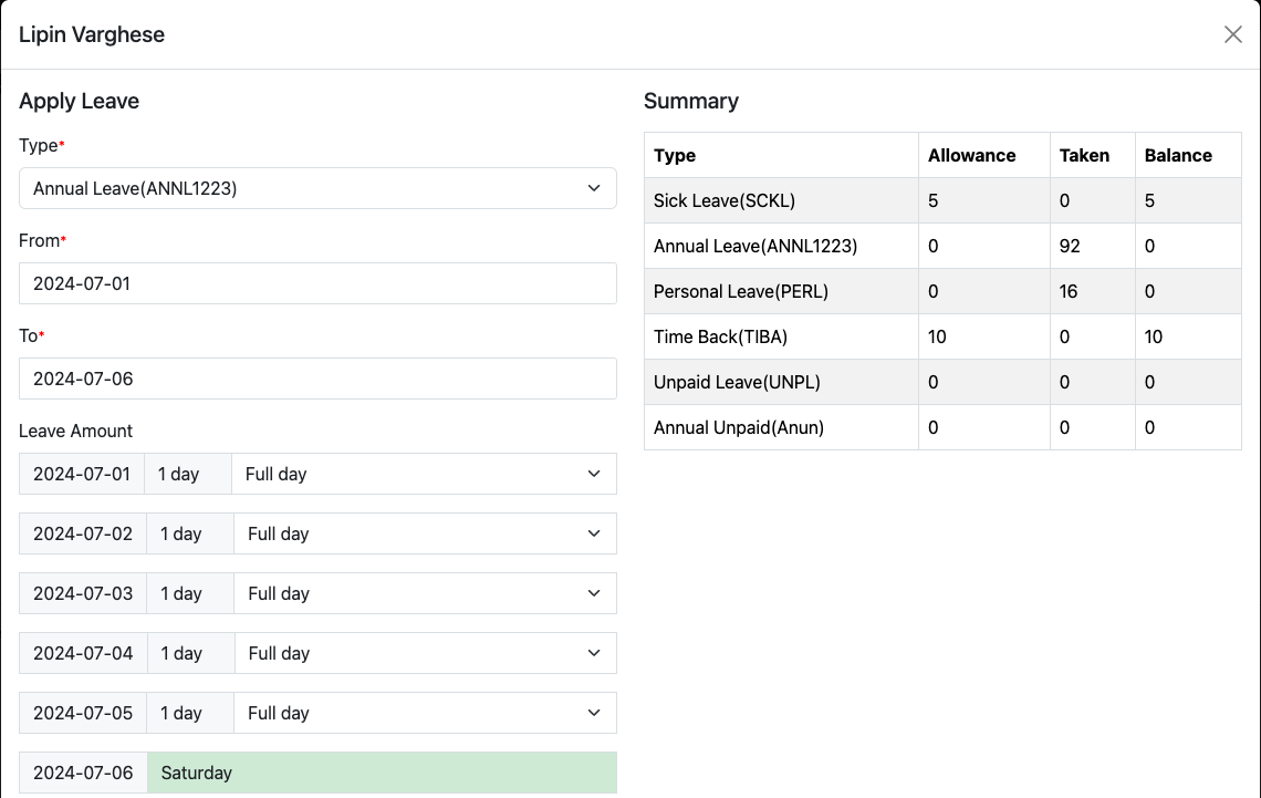 After filling the details, click on the submit button. The admin will get notification on the leave application.Here we are applying for an annual leave from 01/07/02024 to 06/07/2024.