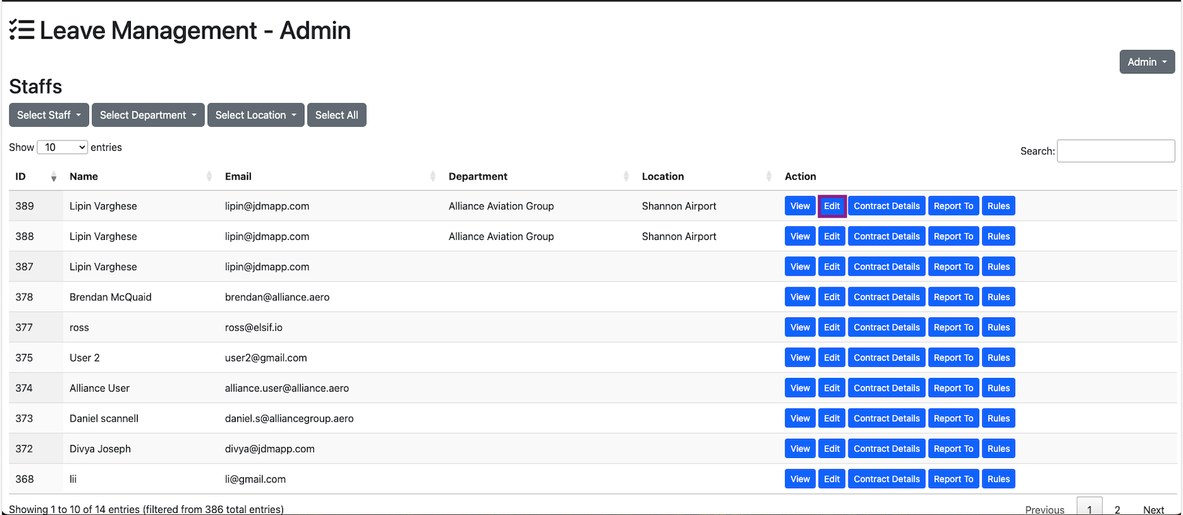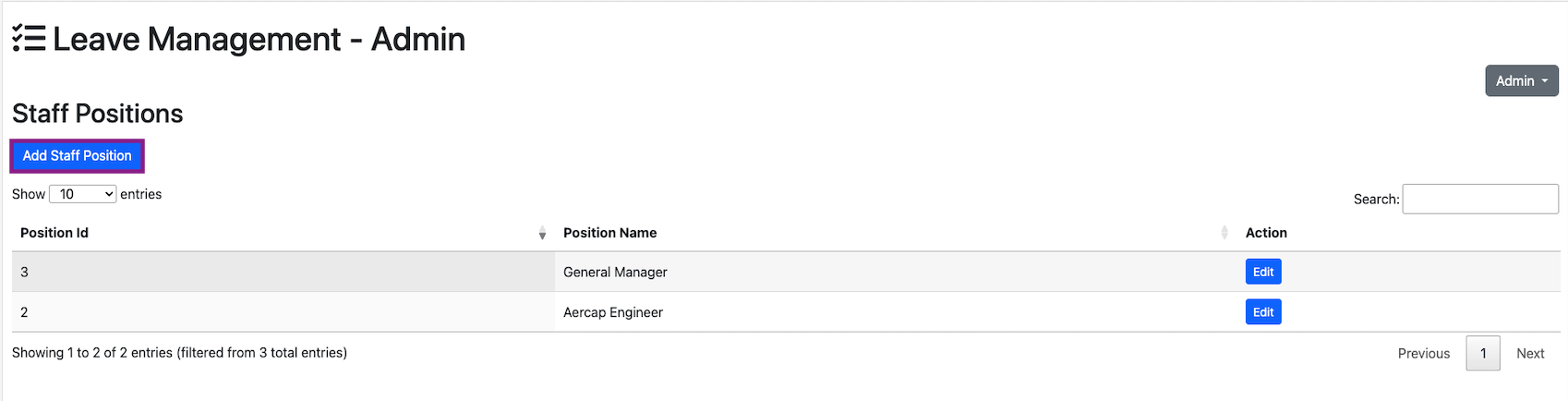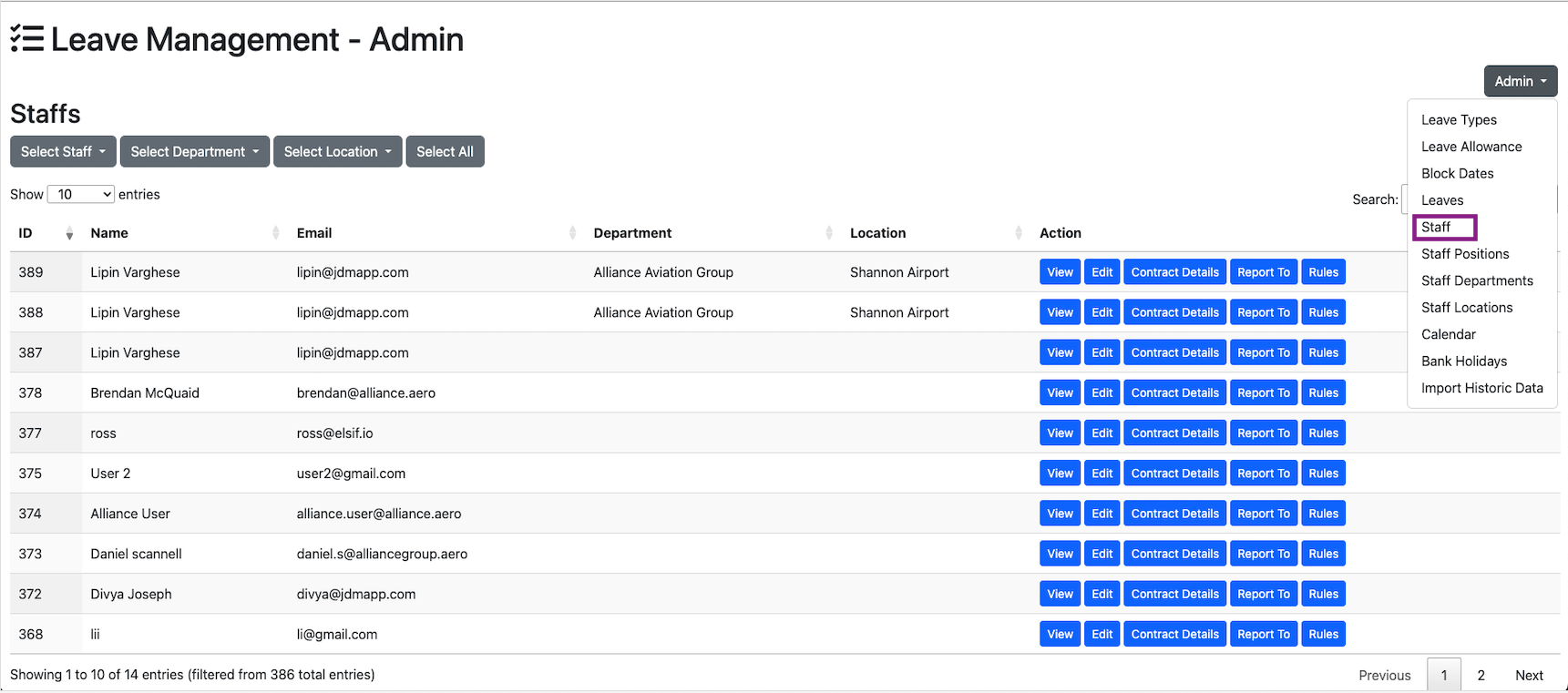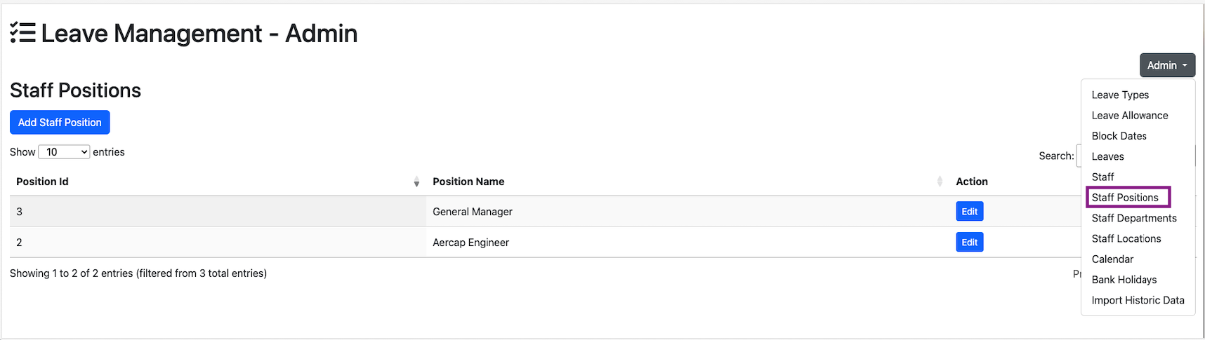 The Admin can add the leave types, leave allowance, blocked dates, Leaves, staff management, staff positions, managing staff departments, managing staff locations, Calendar functions, bank holidays and so on.