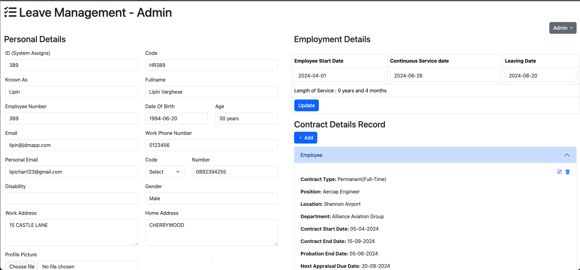 A user can be edited and employment details and contract details can be added by clicking on the Edit button.