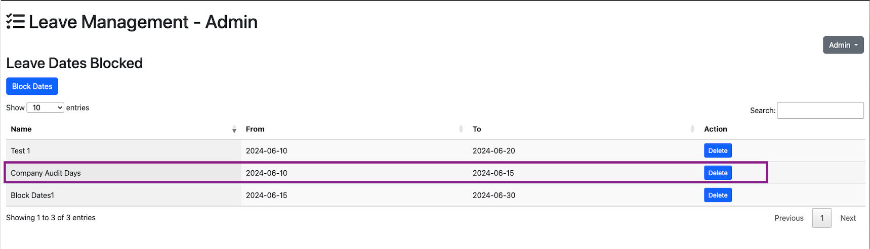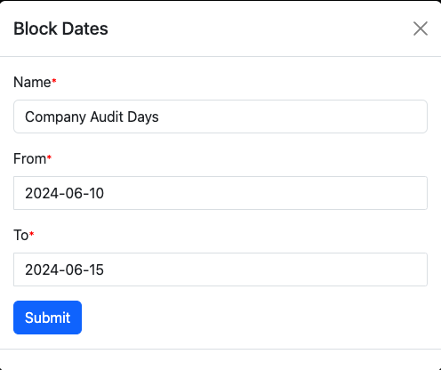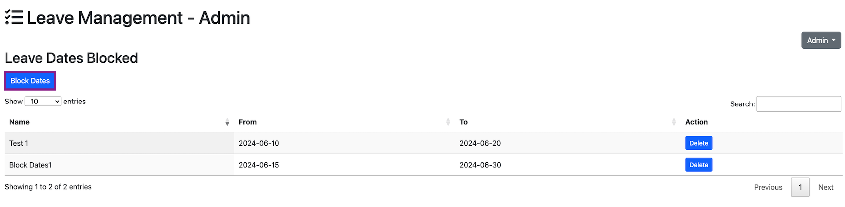 Block dates are the days that no-one is allowed to take leaves.If the dates are marked as blocked, then if someone applies for leaves for the corresponding dates, then it has to show as blocked. Blocked dates can be accessed from the Admin dropdown menu.