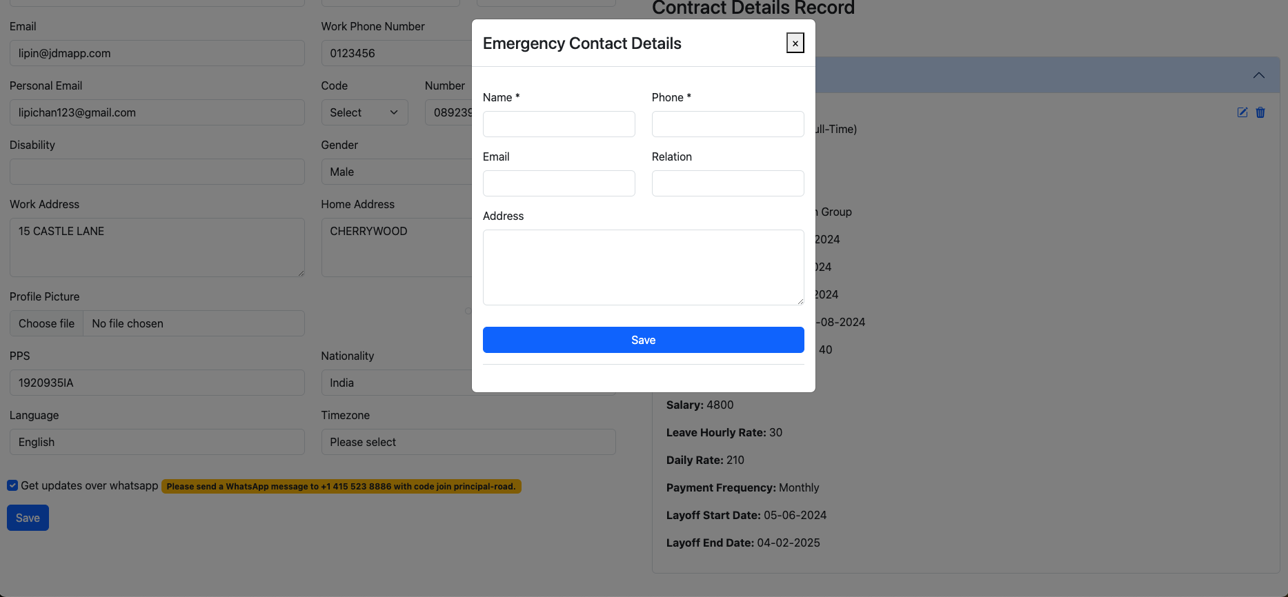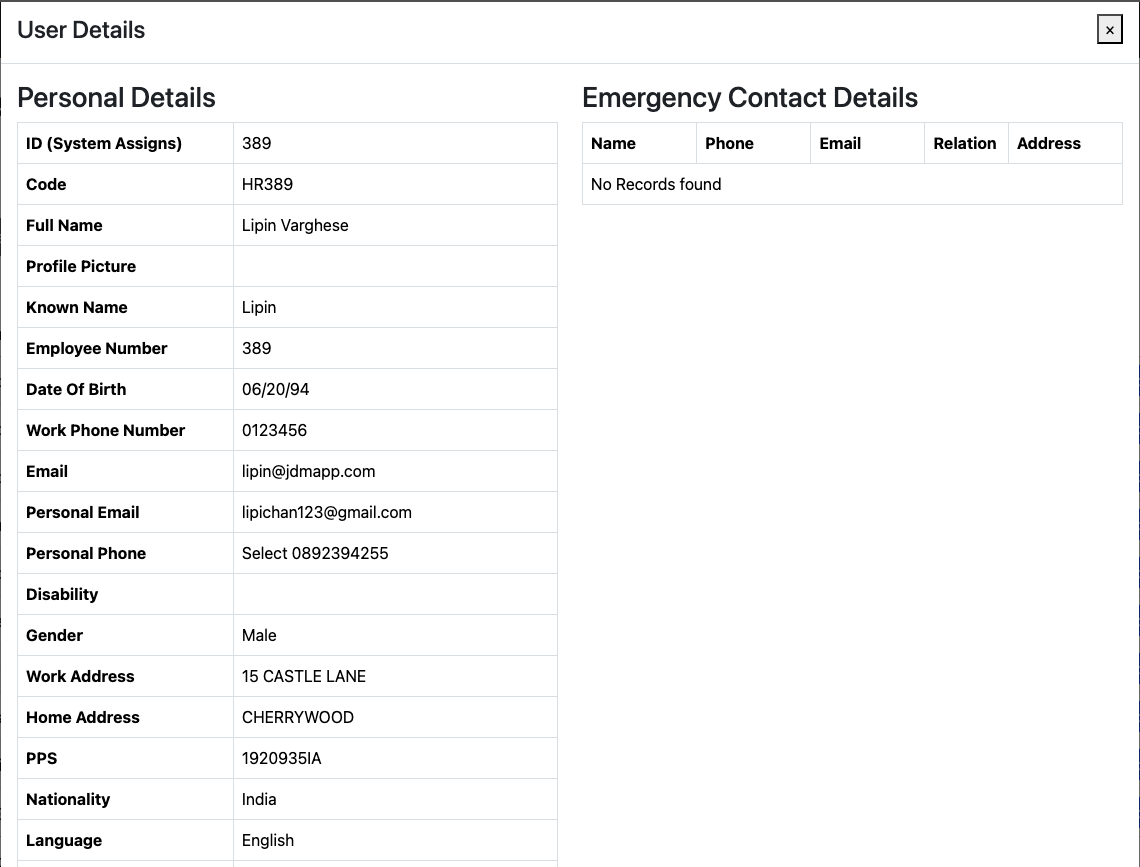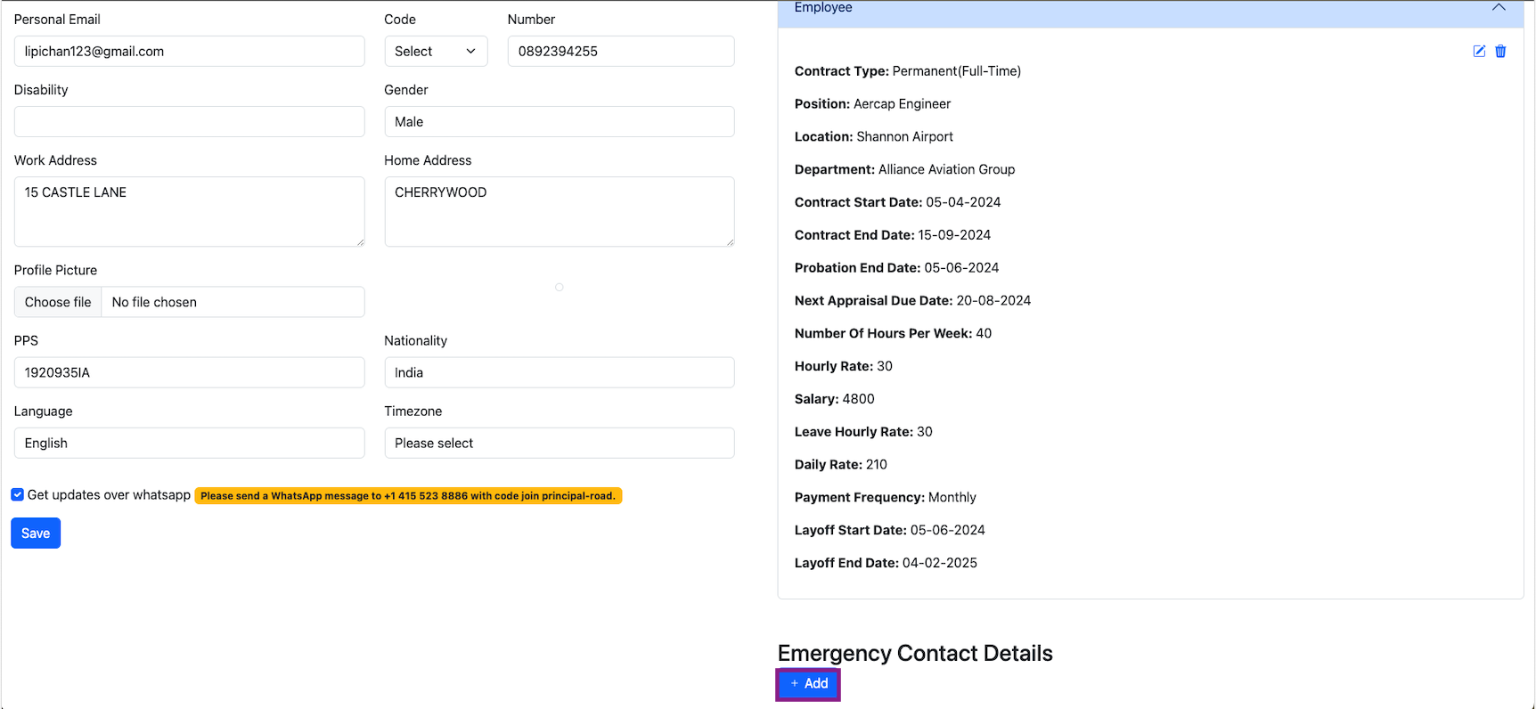 An emergenc contact can be added to a user by clicking on the + Add button on the Emergency Contact Details section on the very bottom right hand corner.
