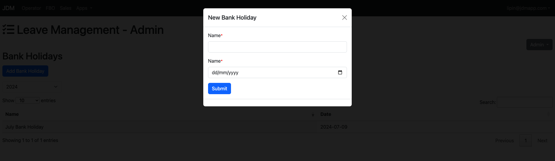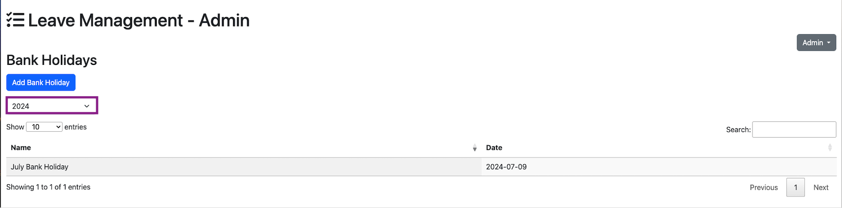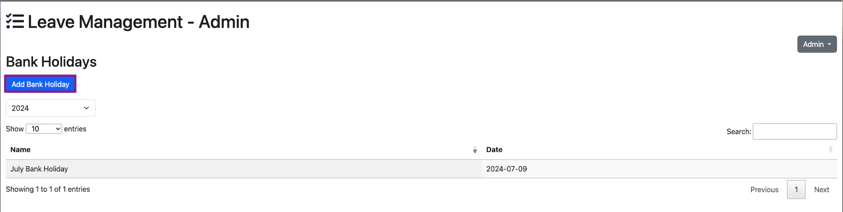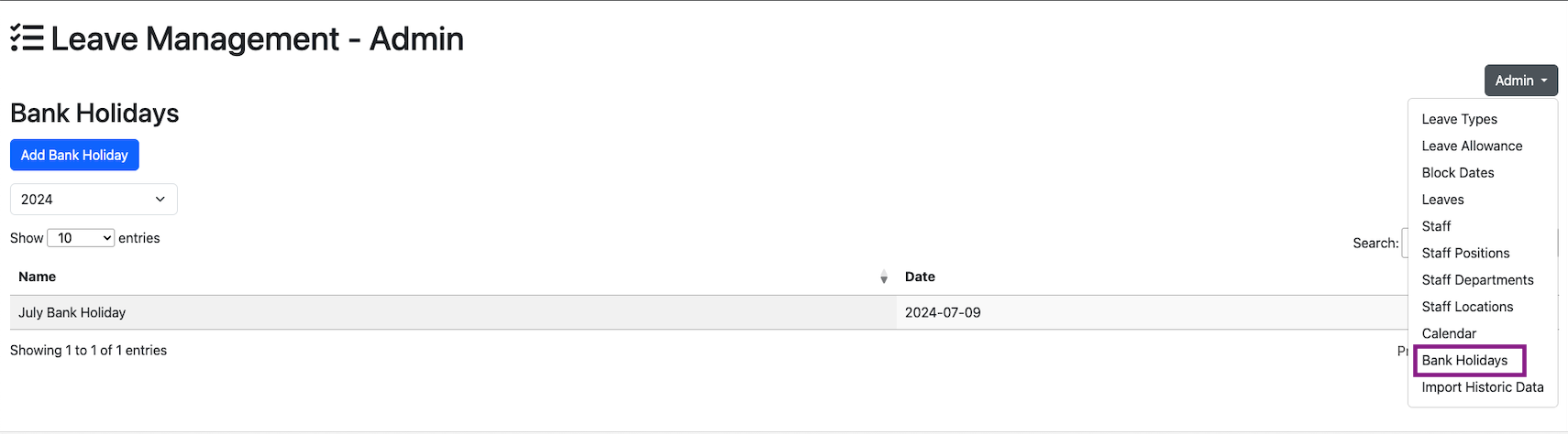 Bank holidays for a year is added from the Bank Holidays section in the admin dropdown.
