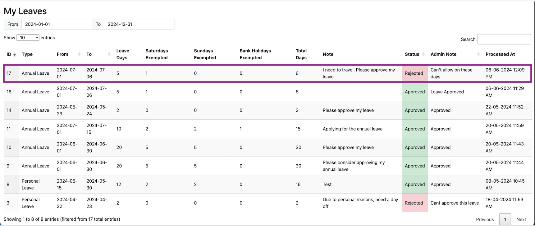 The leave status has been changed to Approved. Now, let's see what happens if the admin rejects the leave application.