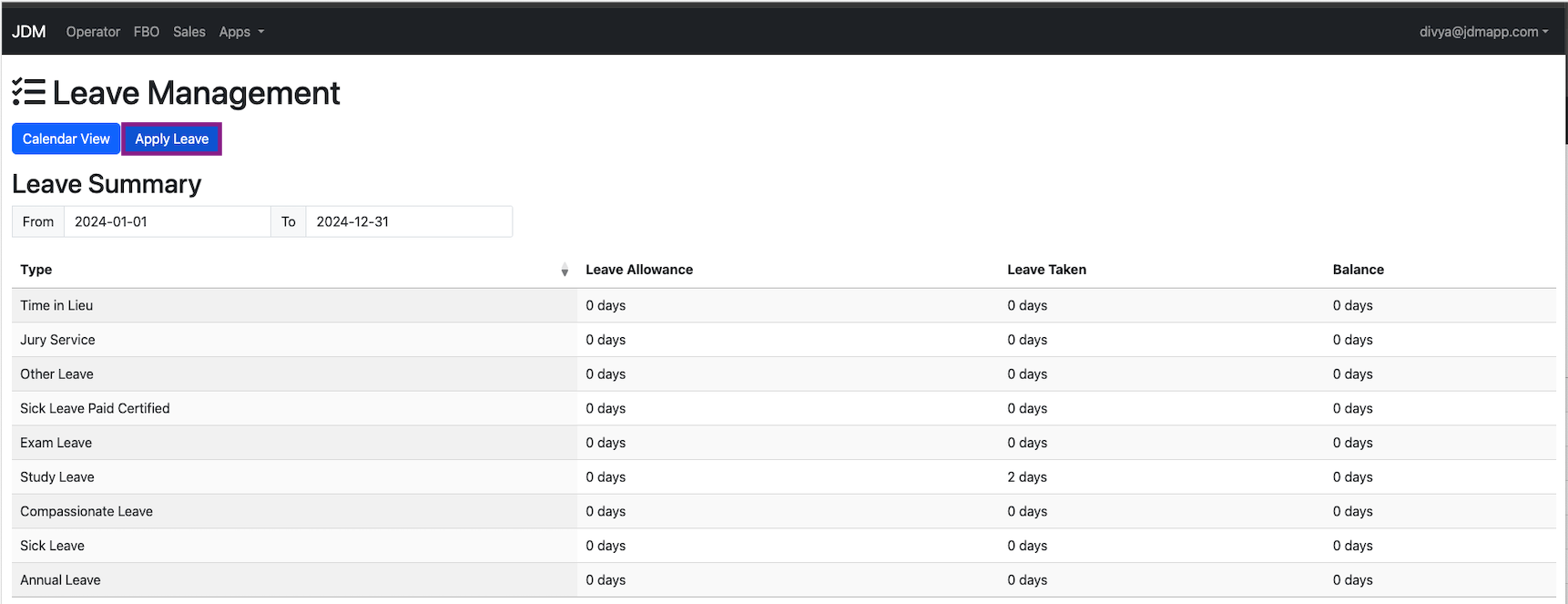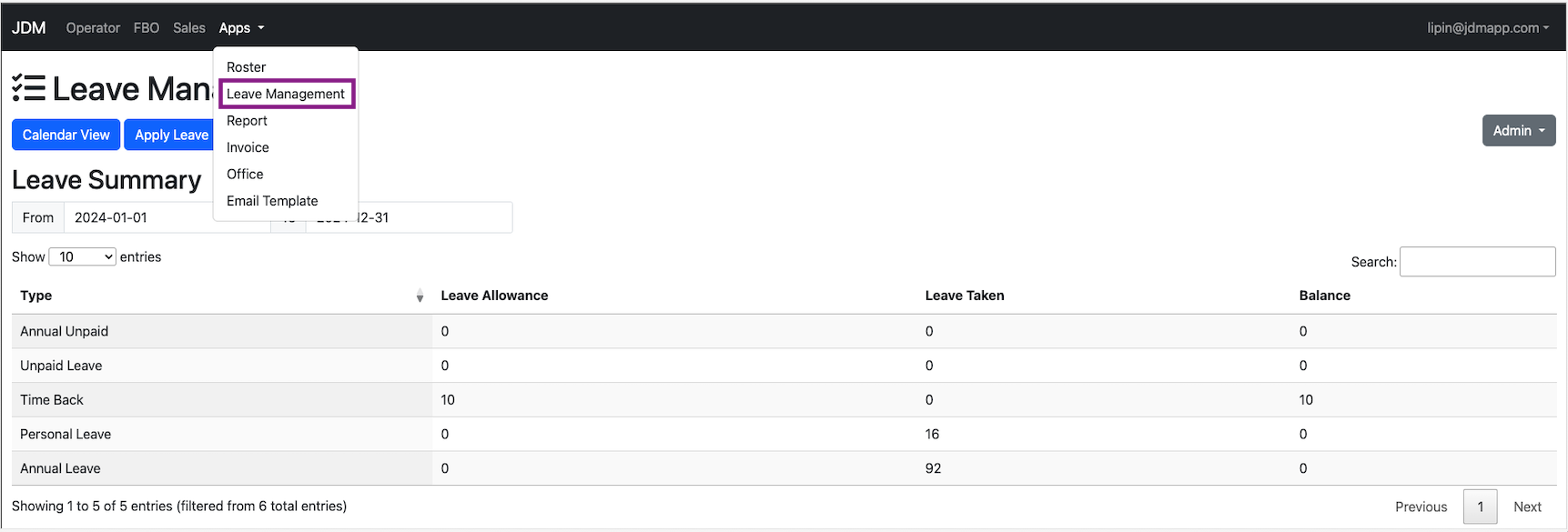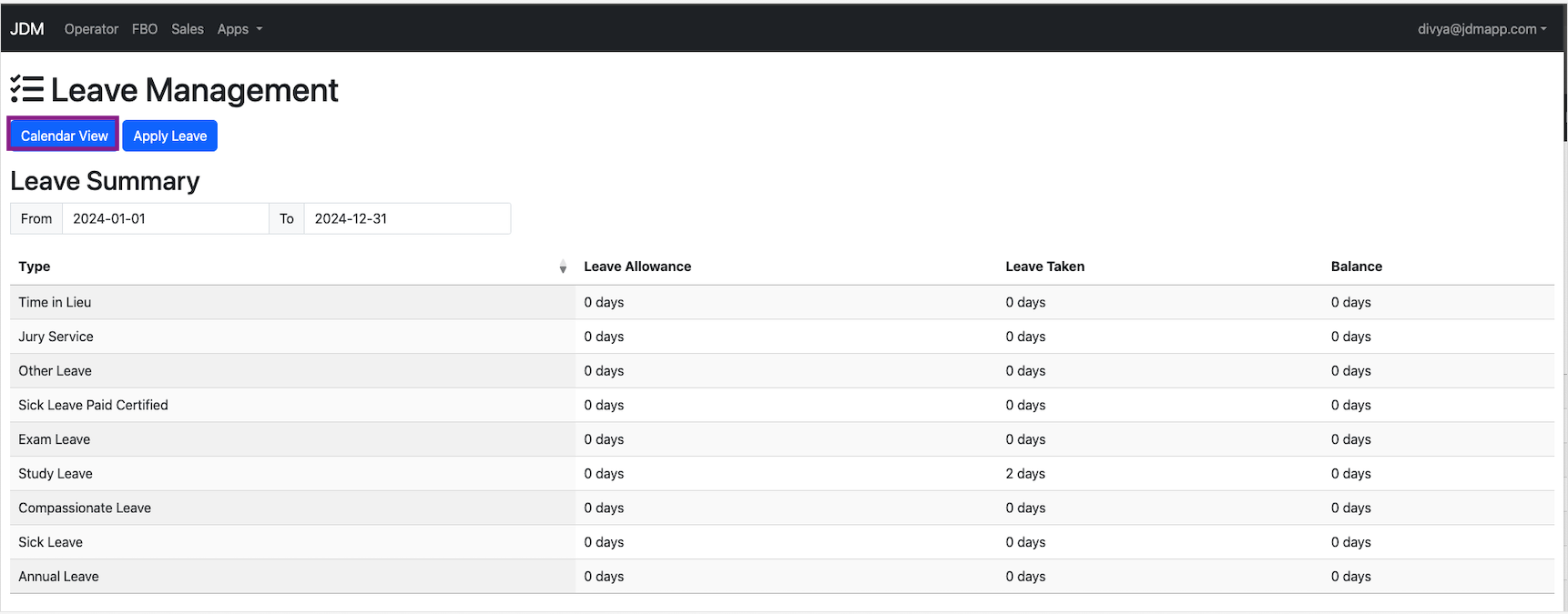 The leave summary has a date filter. It can be used to view the leave summary based on date range.