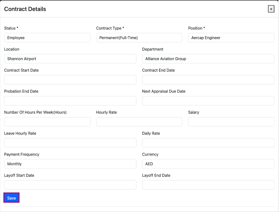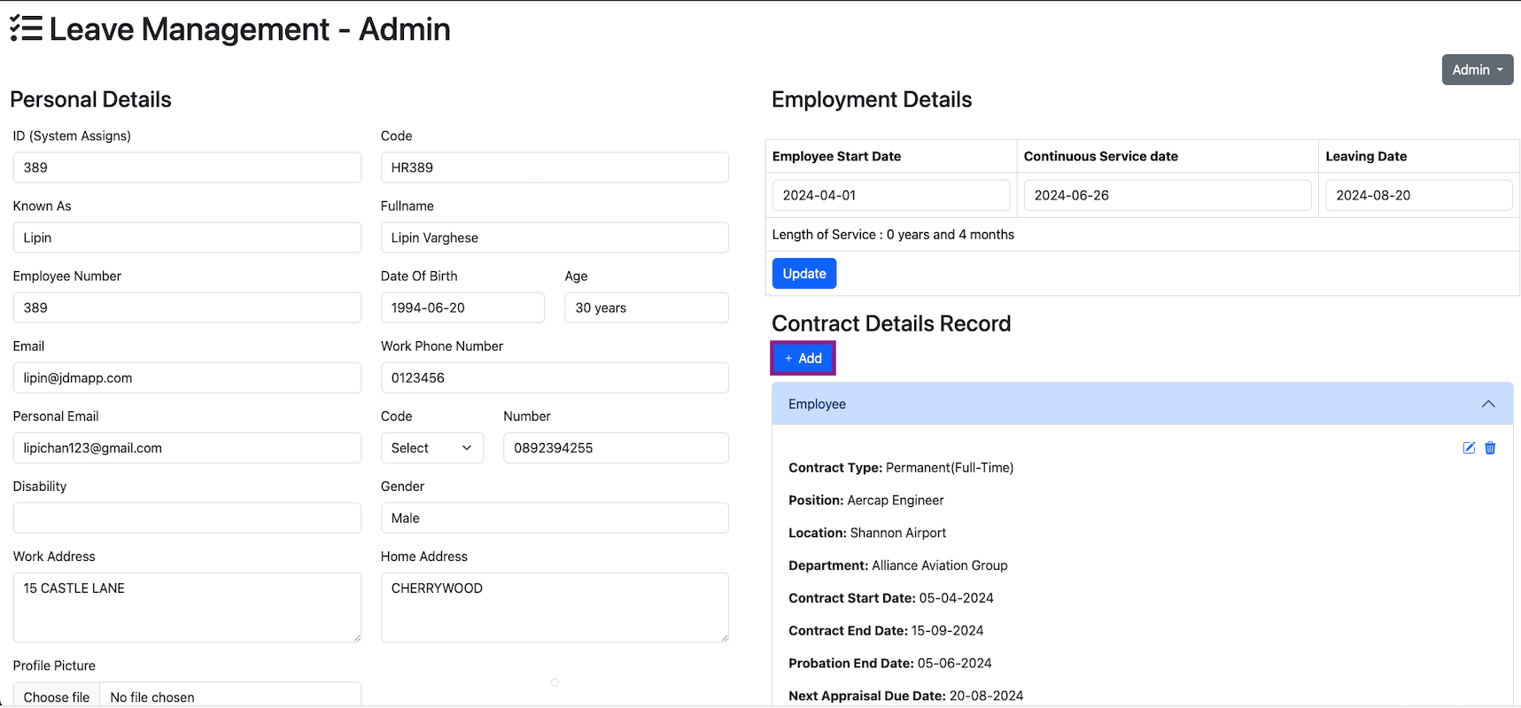 Contract details for a user can be added by clicking on the + Add button on the Contract Details Record section on the mid right hand side.