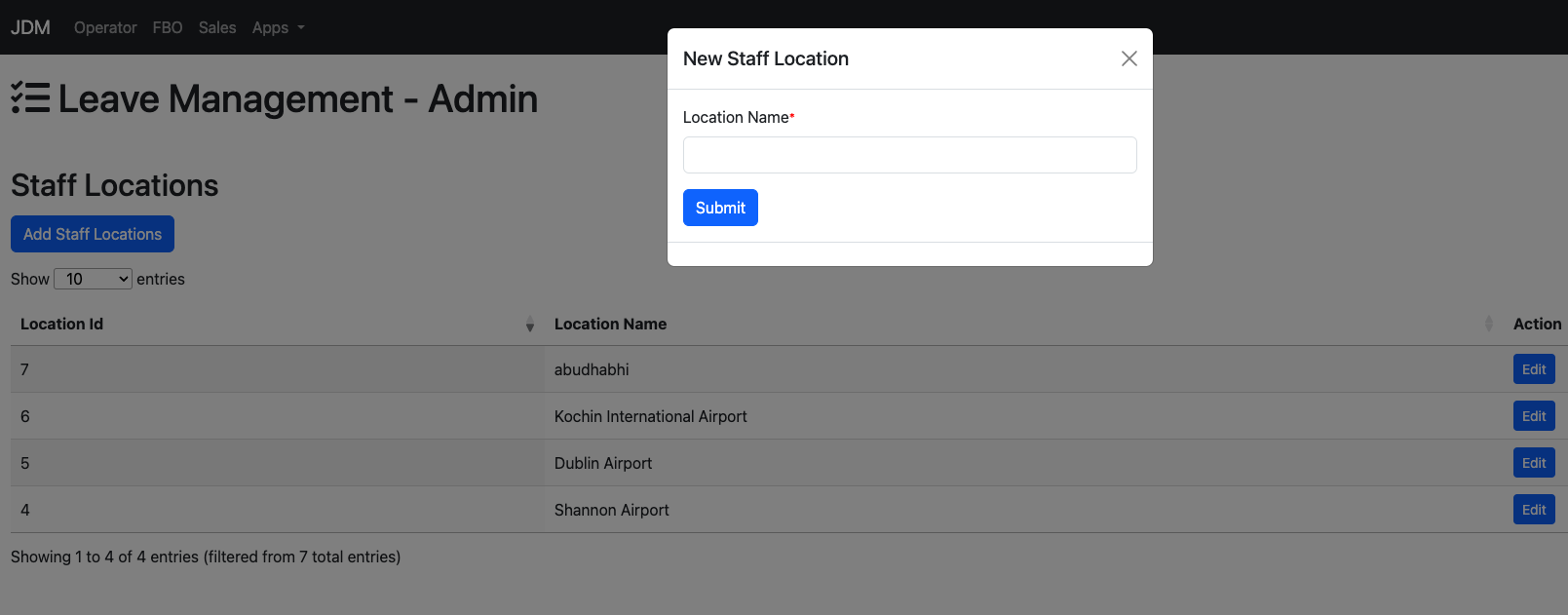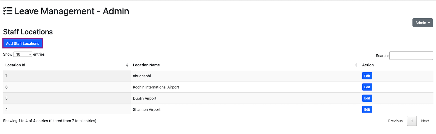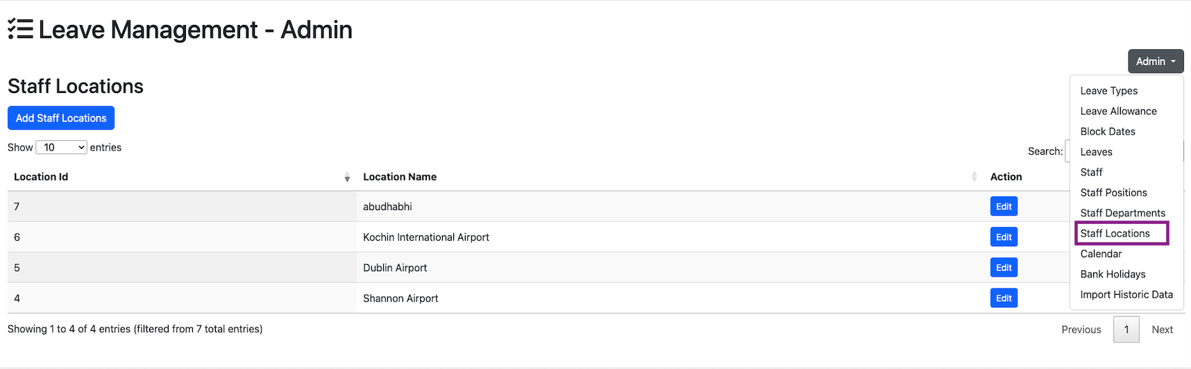 Staff Location canbe added from the Admin dropdown menu,by clicking on the Staff Locations.