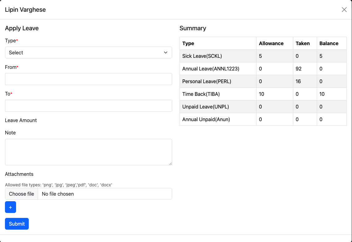 All the leave types belonging to the user, that are added by admin from the admin view, are displayed under the leave summary.