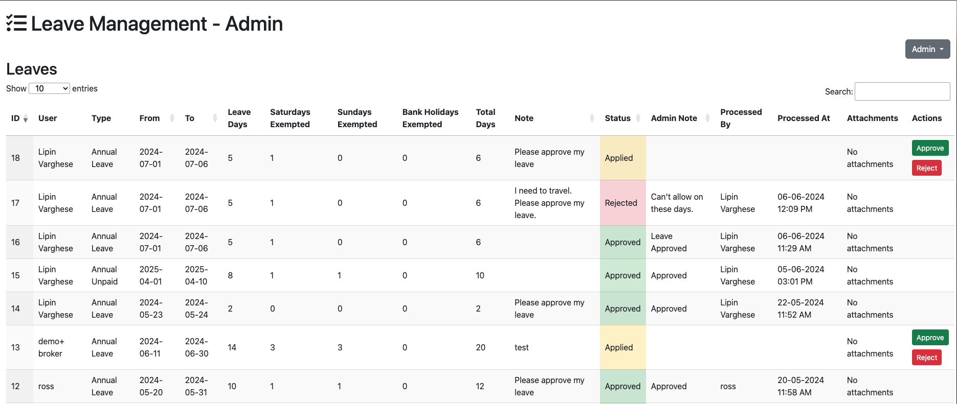 Admin can manage all the leaves from the leave management page. Admin can approve/reject a leave request. All the leave requests are listed on the leave management page. The leaves has 3 states, applied, approved and rejected.