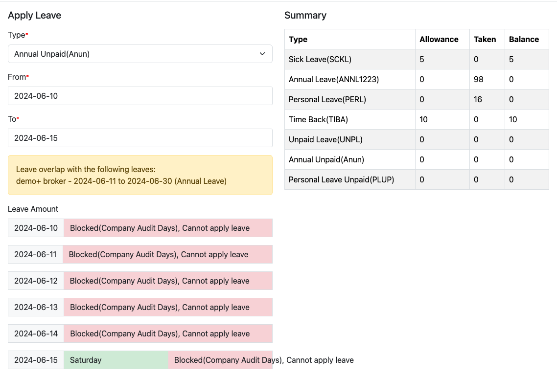2024-06-10 to 2024-06-15 is added as Blocked days. Now a user is applying for leave on these days.