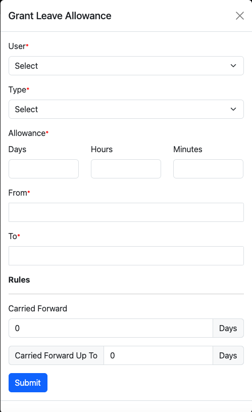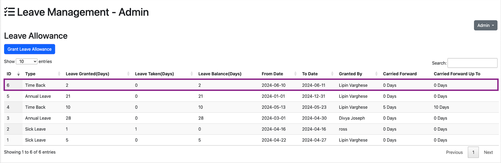 A new leave can be granted by clicking on the Grant Leave Allowance button.