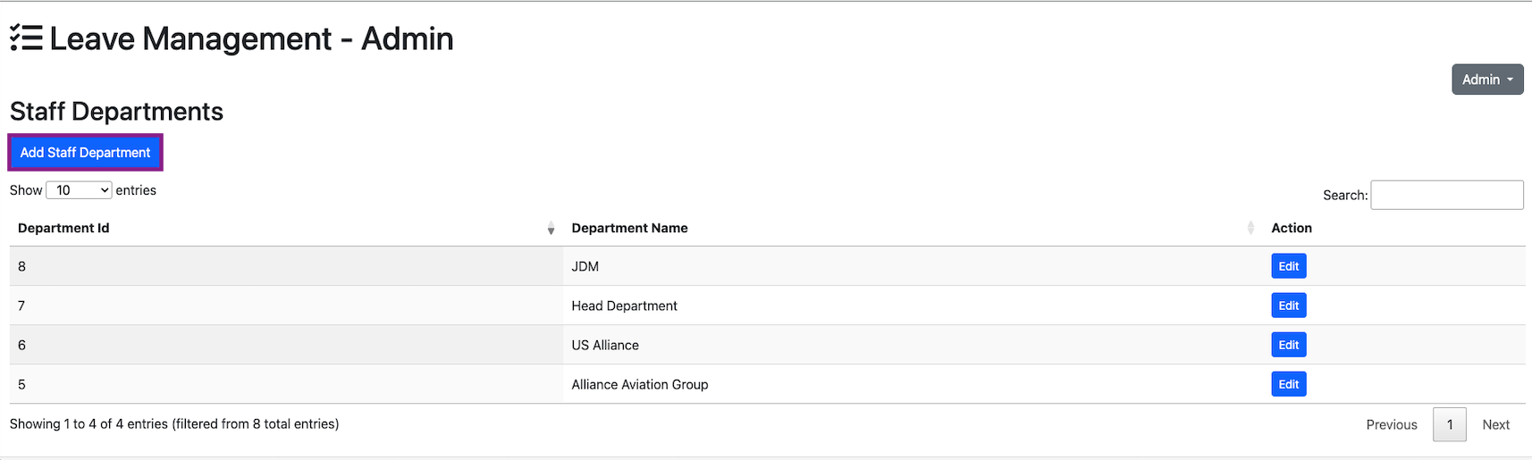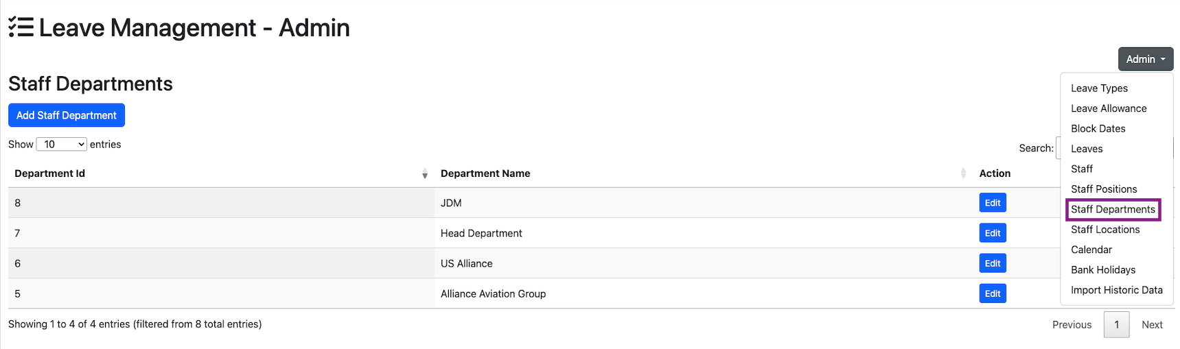 Staff Departments are added from the Admin dropdown menu, by clicking on the Staff Departments.