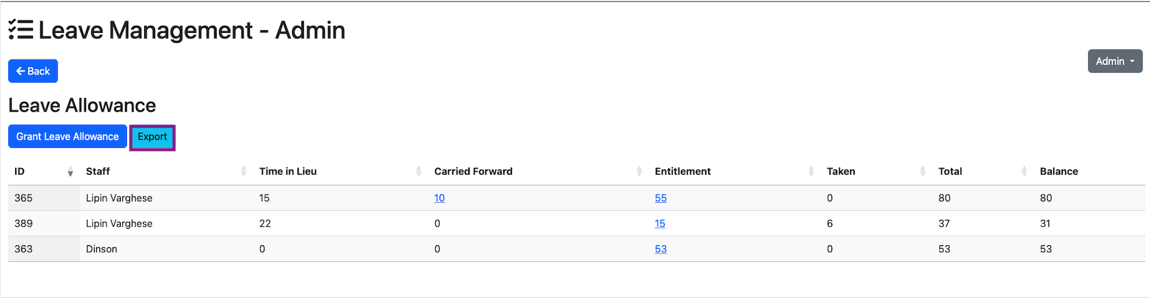 The leave allowances can be Exported by clicking on the Export button on the left hand side.