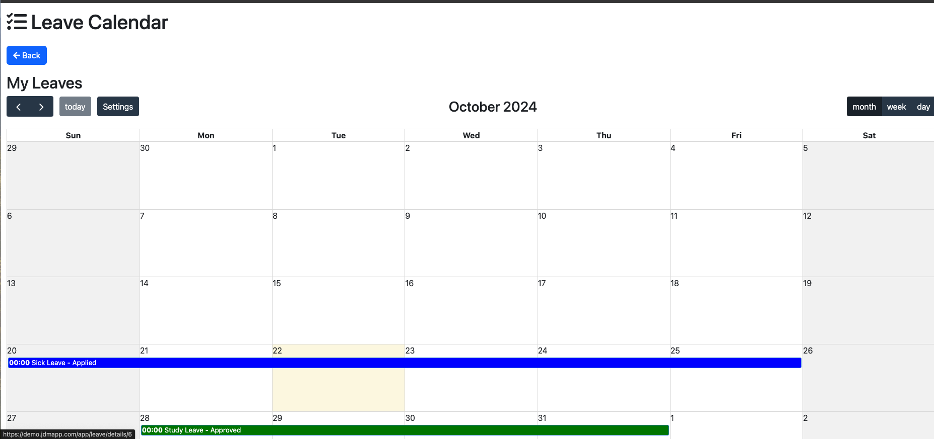 Employees can apply for the leave and track the status of the leave in user login. Employees can access the calendar view of the leaves by clicking on the Calendar View button on the top left most corner.