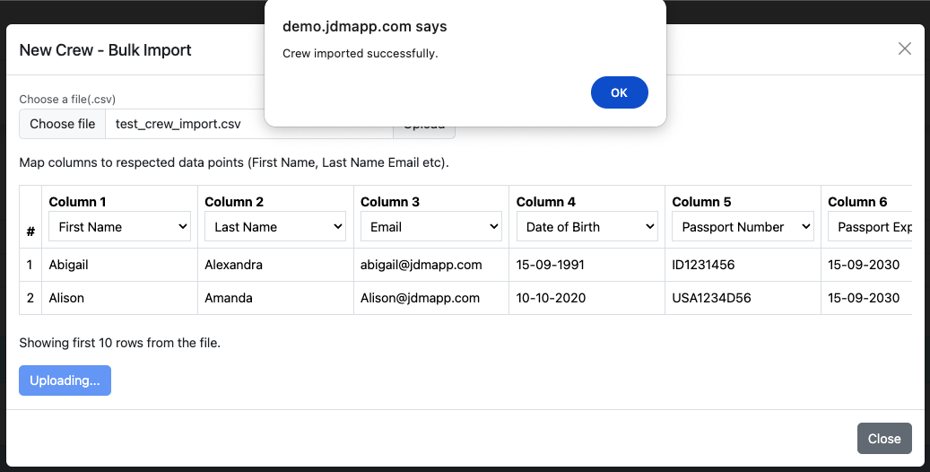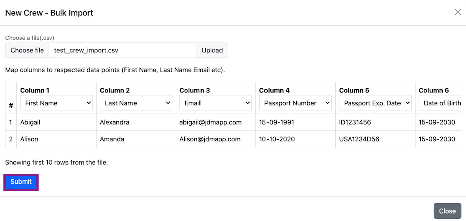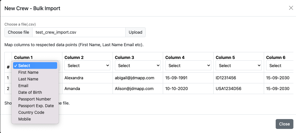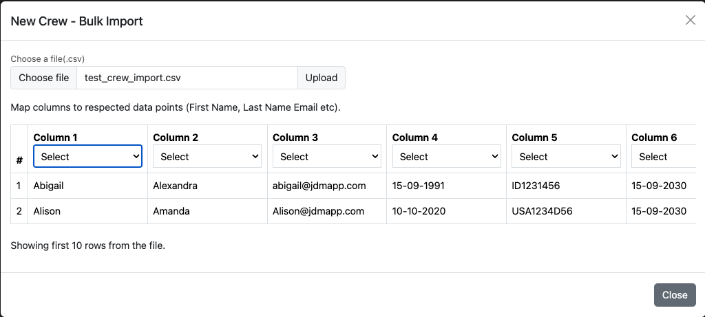 Crew can be bulk imported and the columns can be selected from the dropdowns.