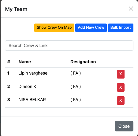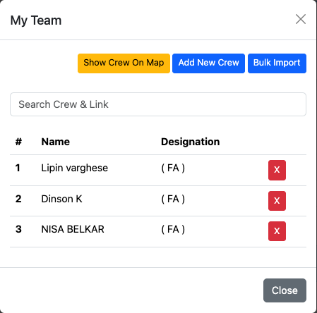The Lead FA can link FA to his/her team. The lead FA has the map view of the tram crew. Lead FA has the privilege of adding new crew or bulk importing the crew set. A new crew can be added by clicking on the Add New Crew button.