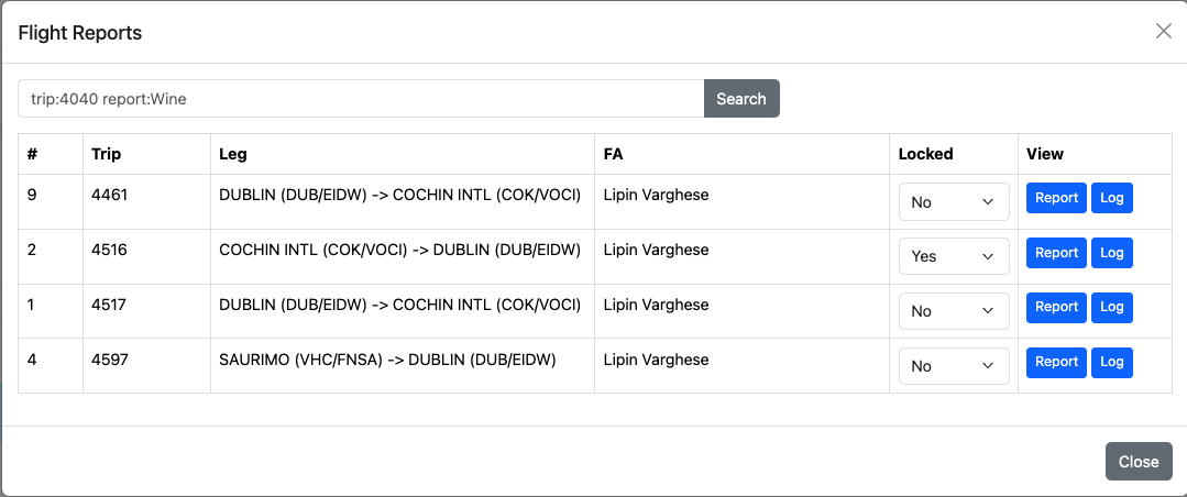 The lead FA can view the flight reports and log from the Flight report tab.