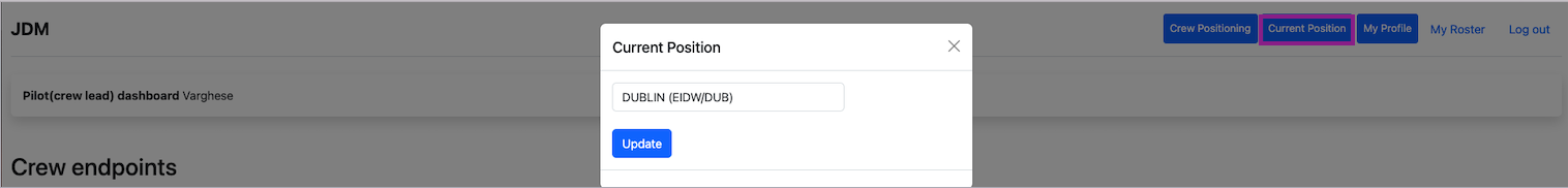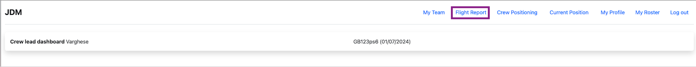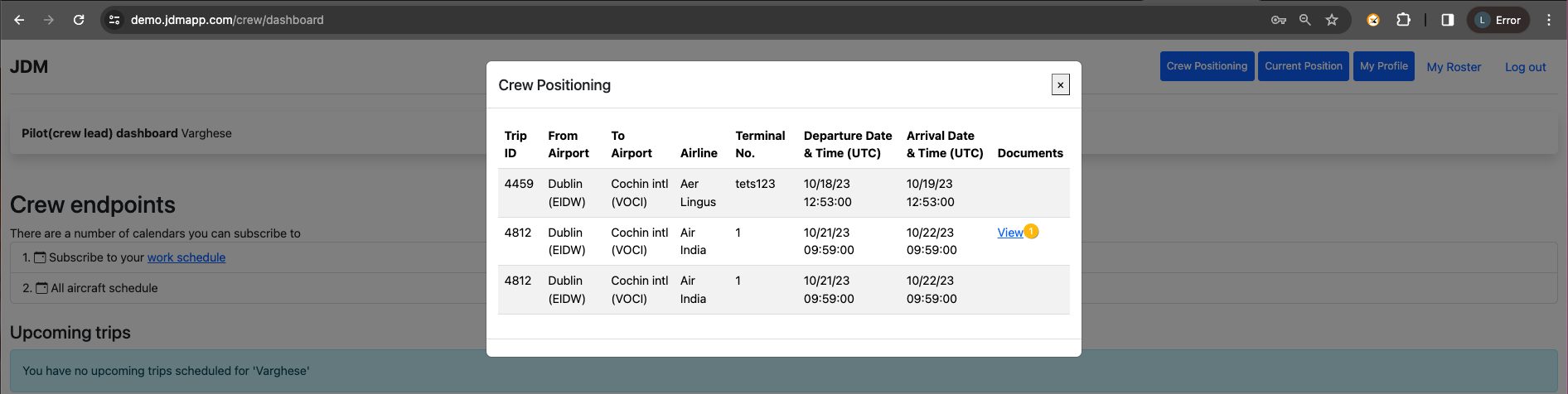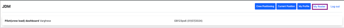 Crew dashboard for pilots can be accessed from https://demo.jdmapp.com/crew/dashboard. Based on the crew designation, the crew dashboard and functions are different. Here, taking pilot in command Lipin Varghese(Passport no: GB123ps6) as an example.
