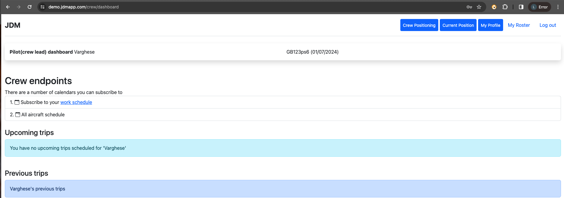 The pilot dashboard comes with the features crew positioning, current position, my profile, my roster, upcoming trips and previous trips.