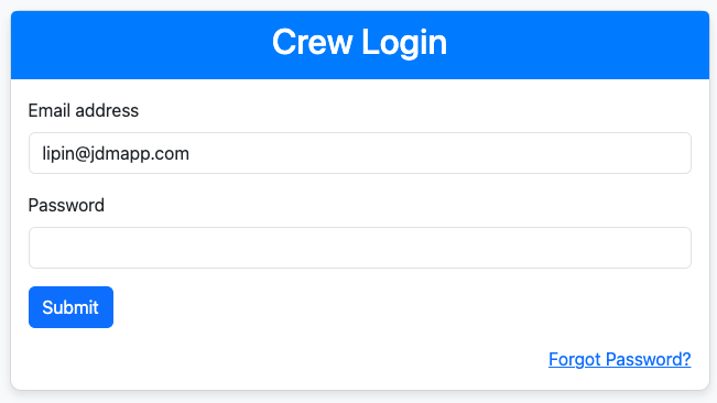 Crew module can be accessed from demo.jdmapp.com/crew/auth. The crew has to enter the username and password for accessing the crew dashboard.