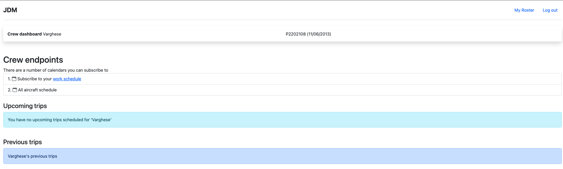 A list of the upcoming and previous trips are listed in the crew login.