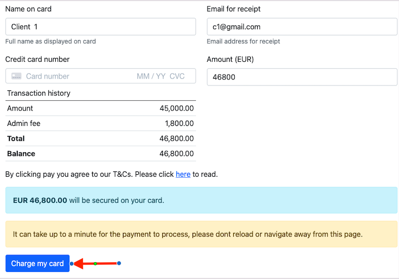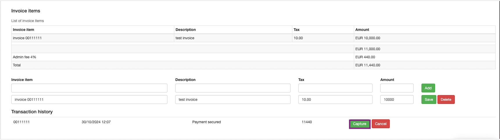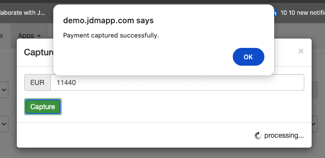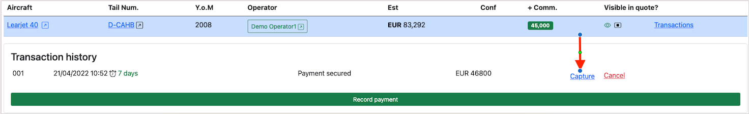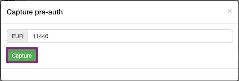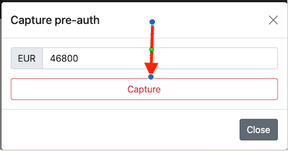 The payment can be captured by clicking on the Capture button in the transaction history.