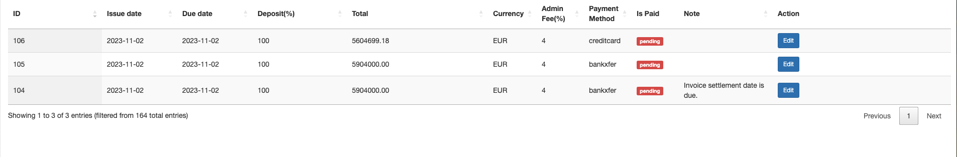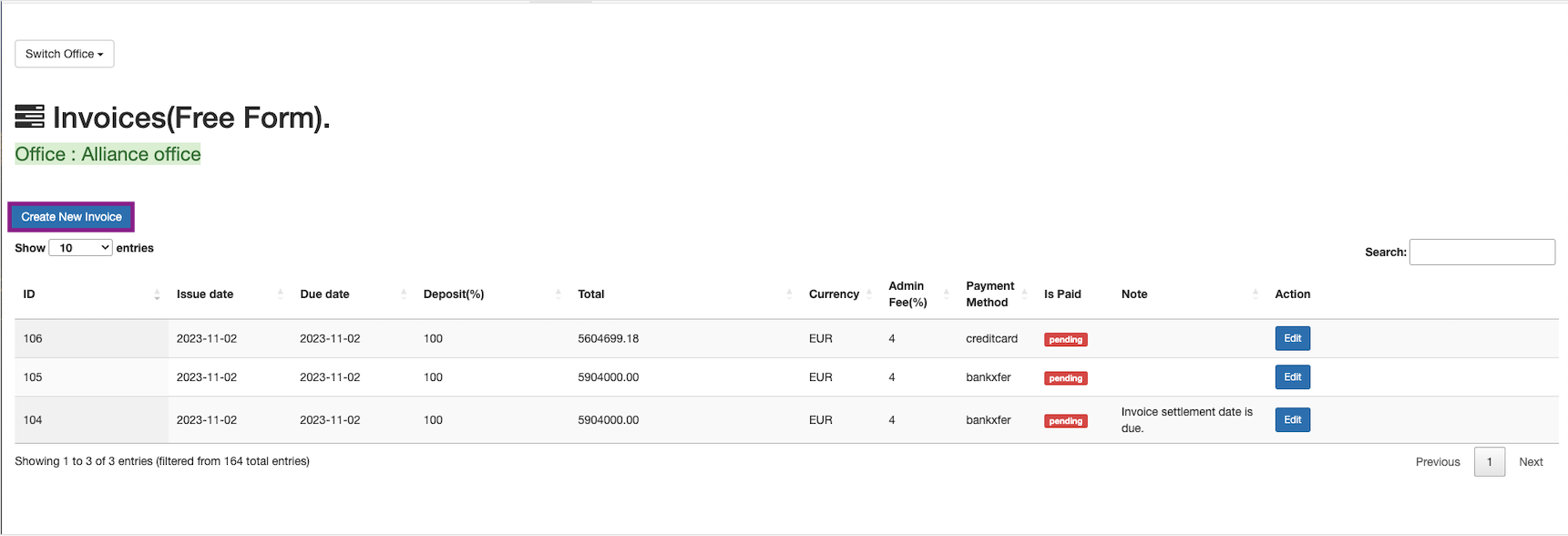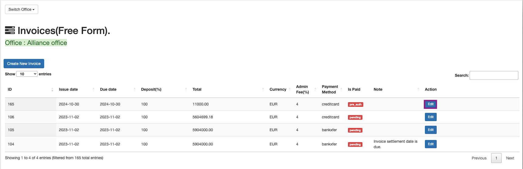 Now the invoice is created and the invoice payment status is pre_auth. The payment can be captured by clicking on theEdit button in the Action column.