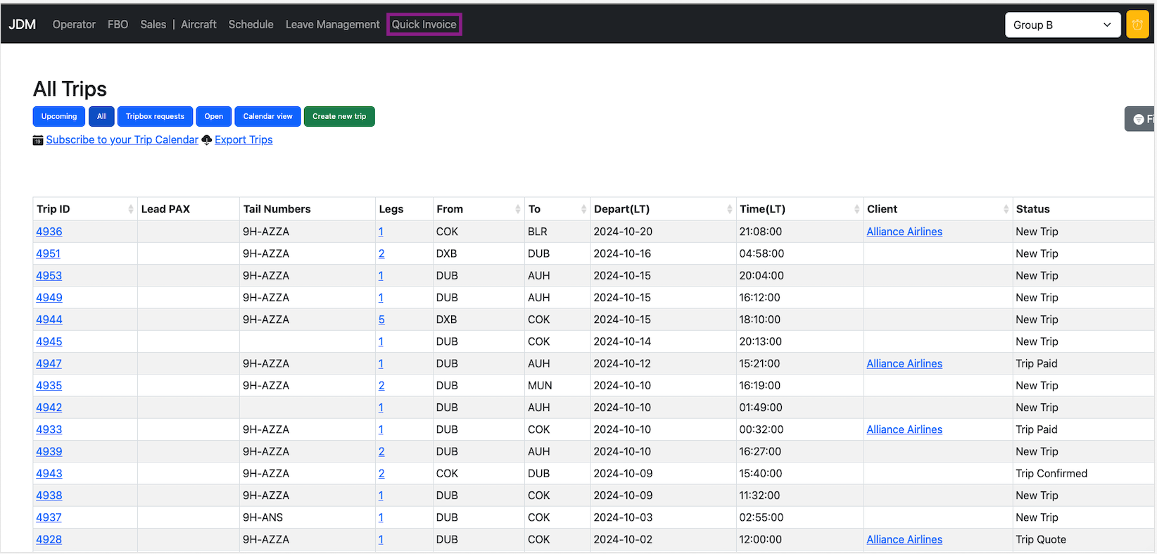 Sales module displays all the upcoming trips, all trips, tripbox requests, open trips, and calendar view.
