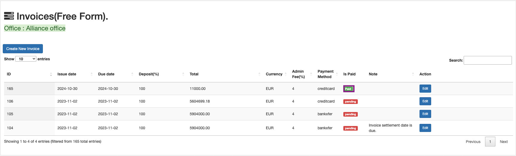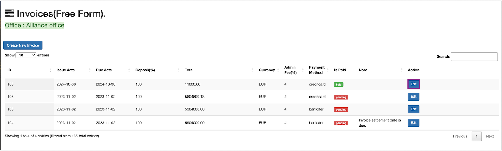All the invoices are listed down in the table with the invoice id, payment status and edit actions.