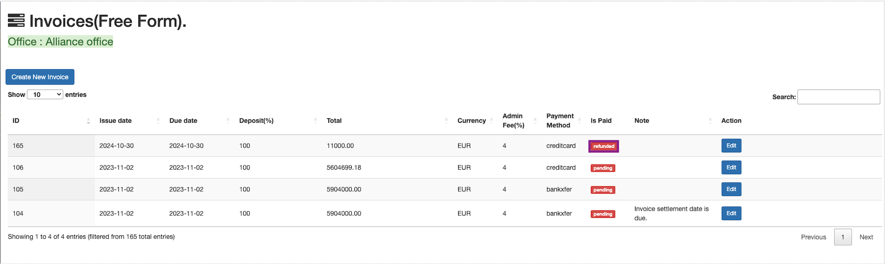 If the invoice needs to be refunded, it can be done by clicking on the Edit button in the Actions.