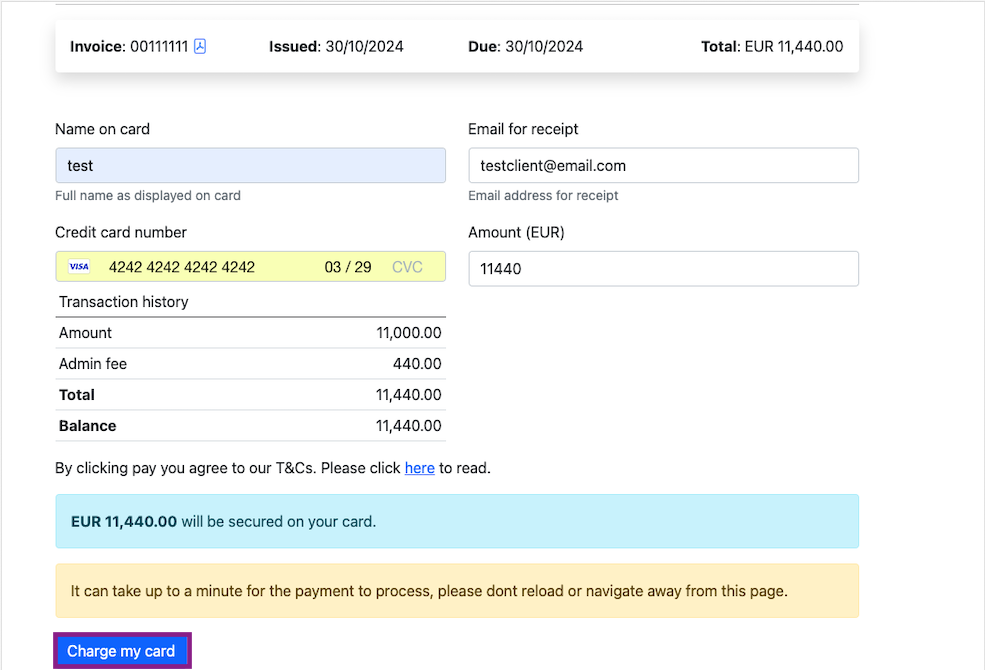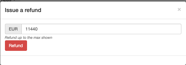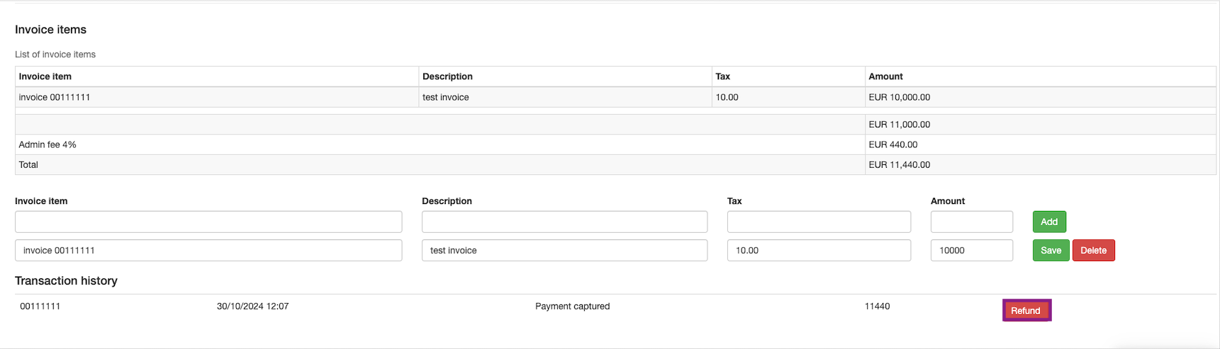 The invoice can be refunded, by clicking on the Refund button in the transaction history.
