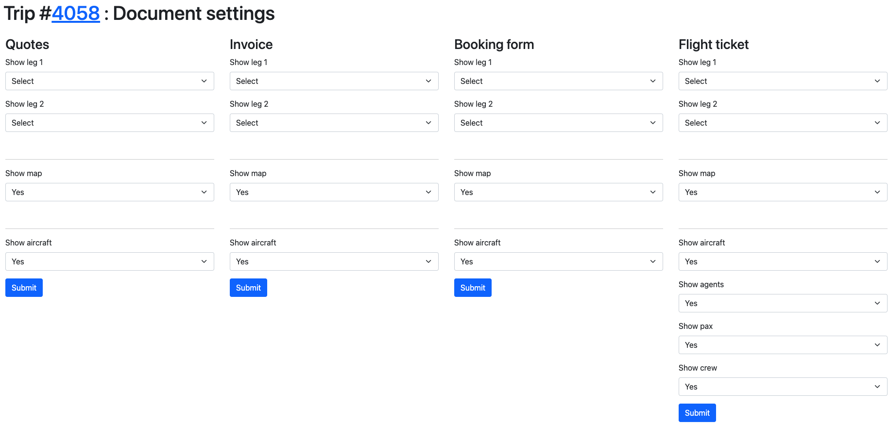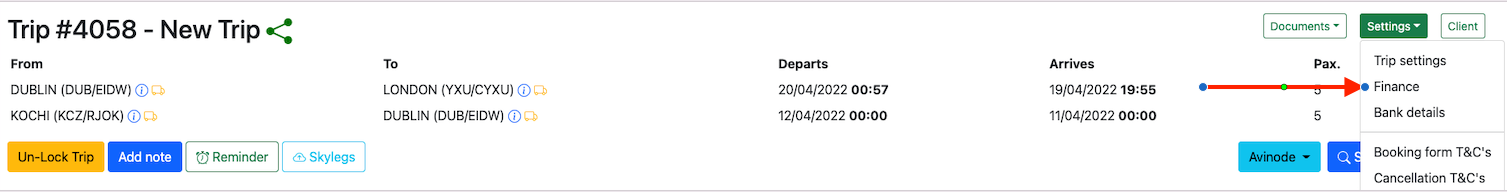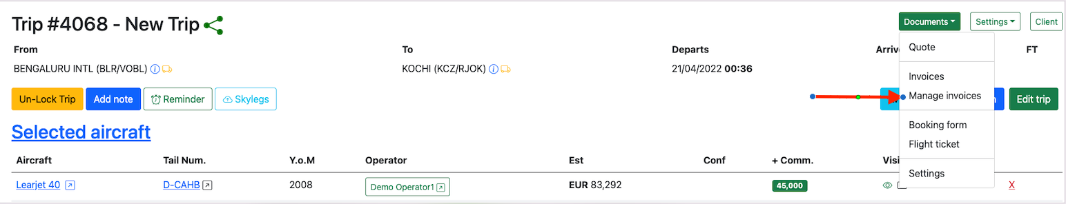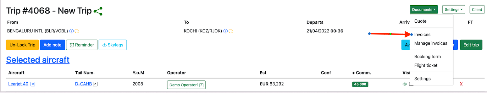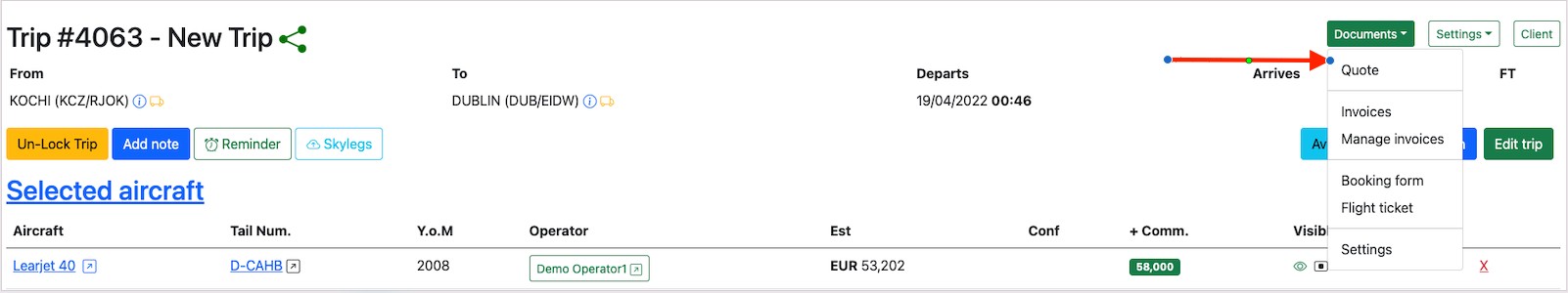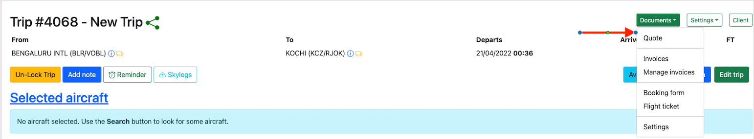 Assign a quote to the trip by clicking on theDocuments button and selecting Quote.