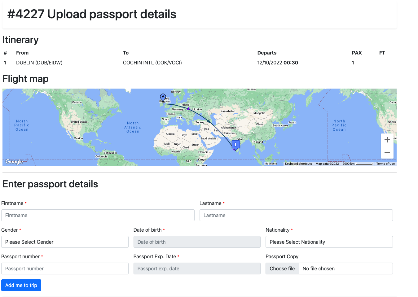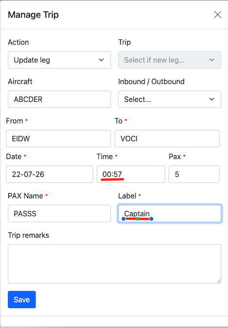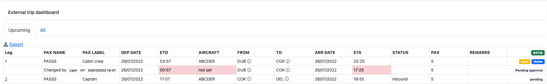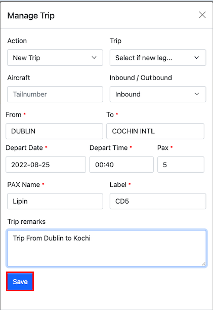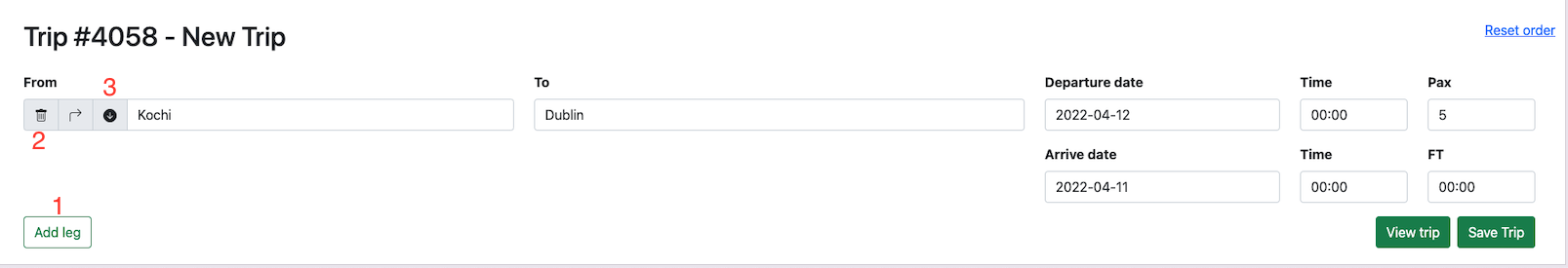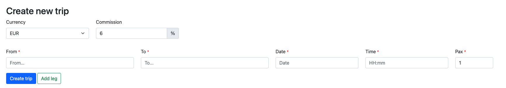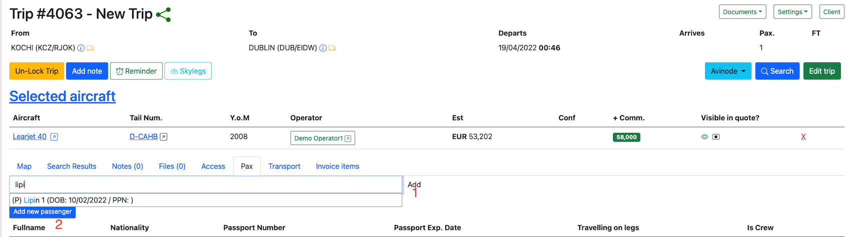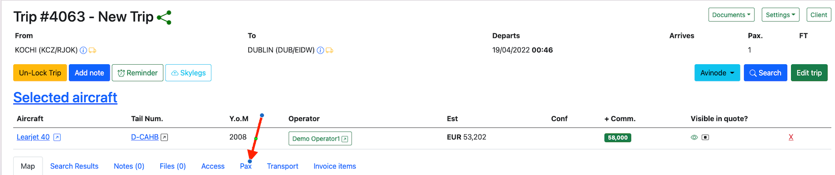 Passengers can be added to trip by clicking on the Pax button.