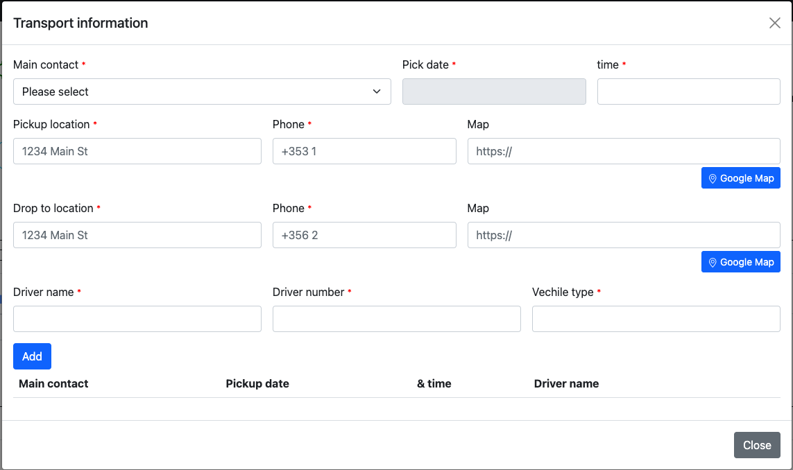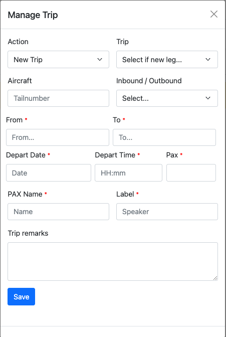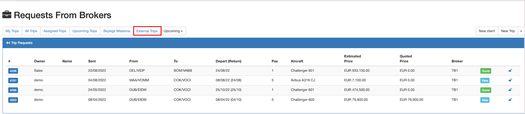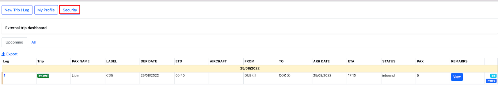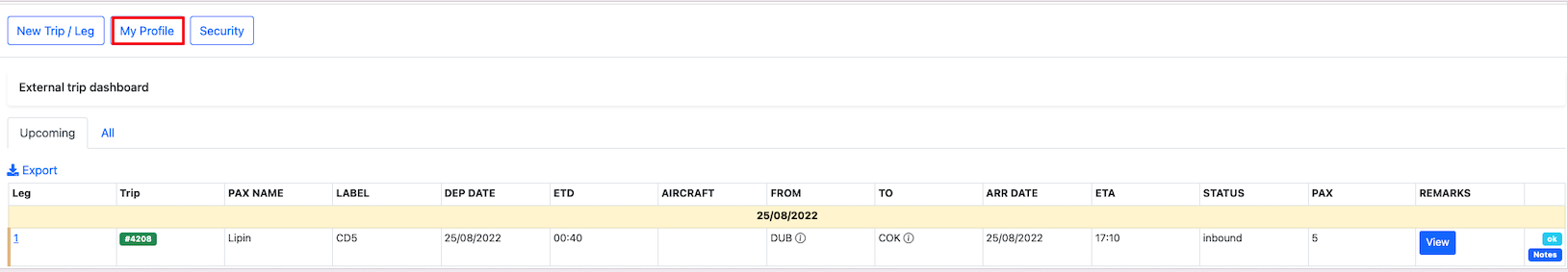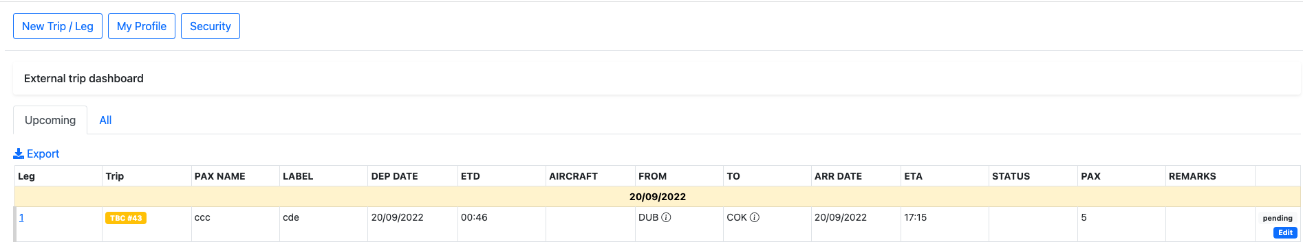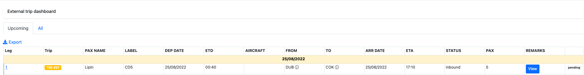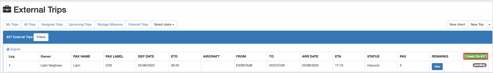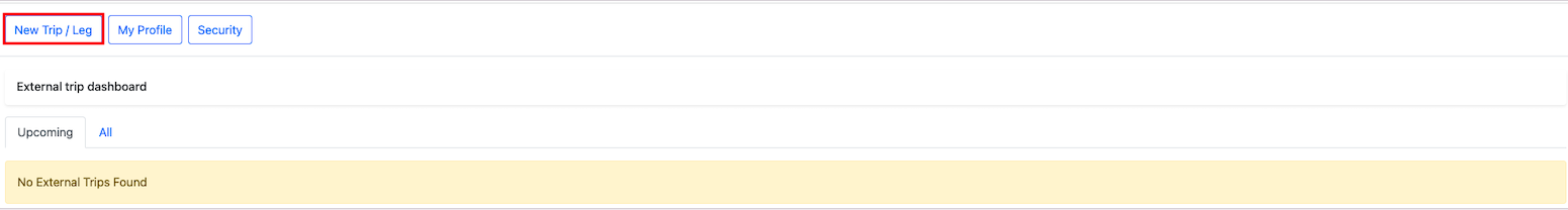 A new trip can be created on external dashboard by clicking on theNew Trip/leg button.