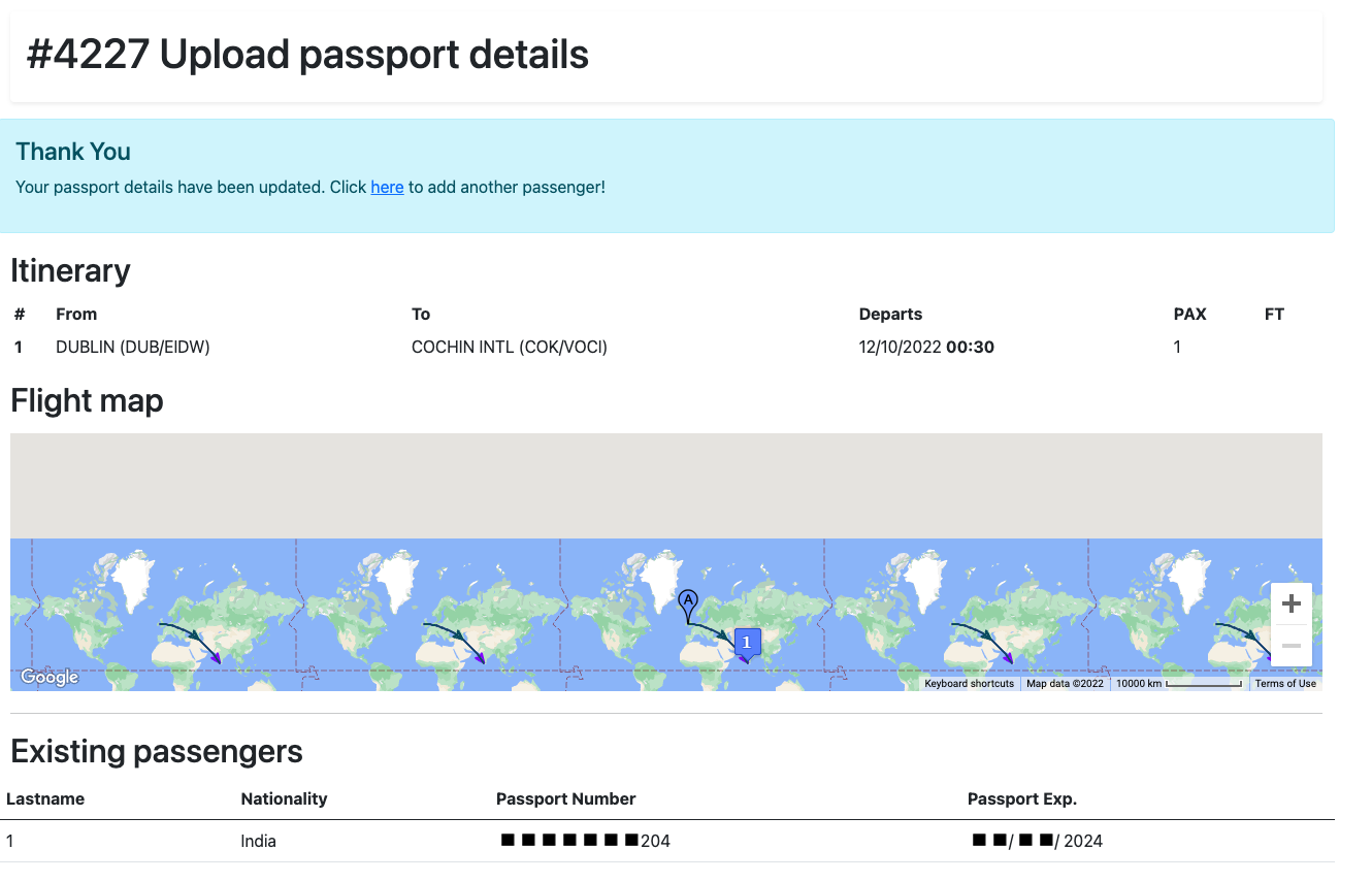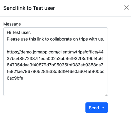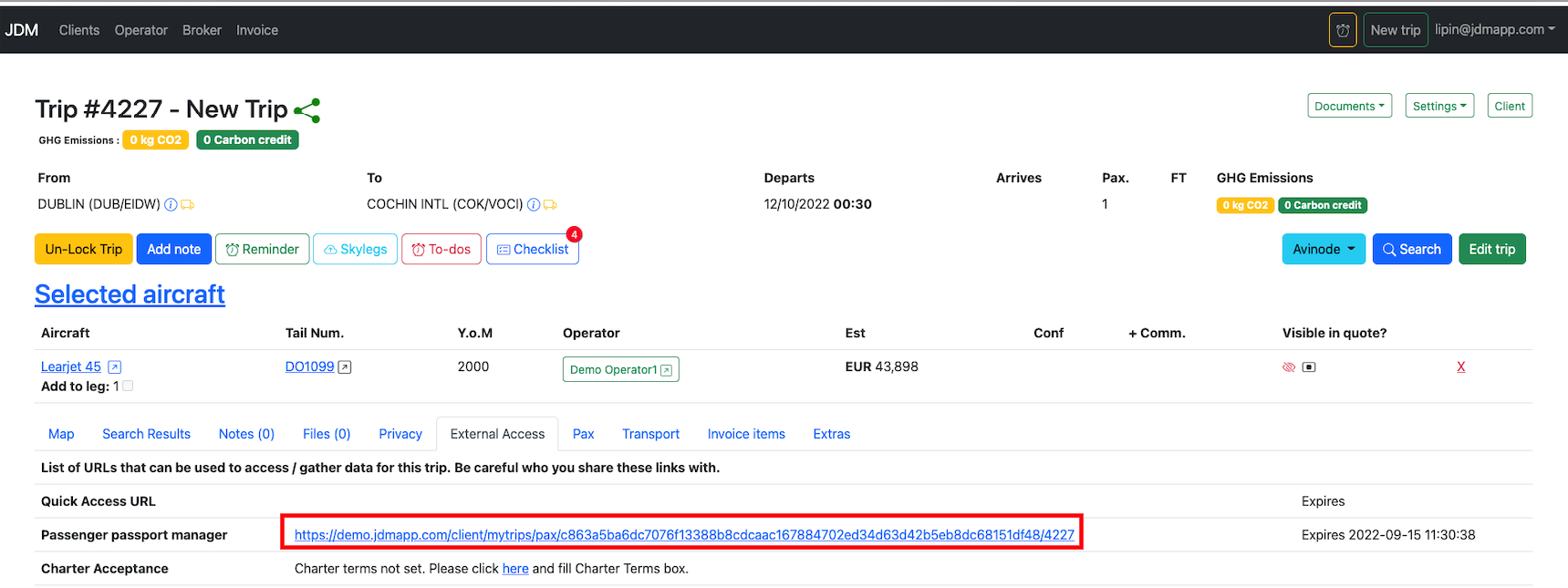 An external person can add passengers to a trip and can bulk import passenger passport information to JDM. Access for an external person is generated from the External Accessbutton. Also you can find out here the access url as well