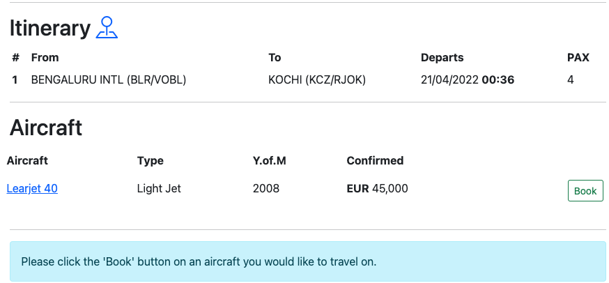 Now, click on the Book button for adding aircraft to the trip.