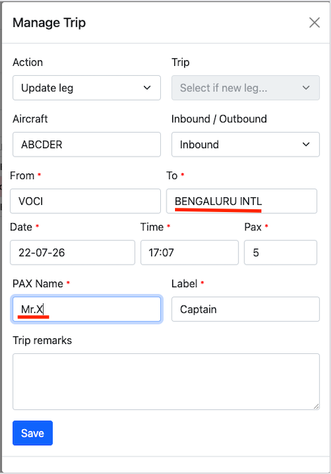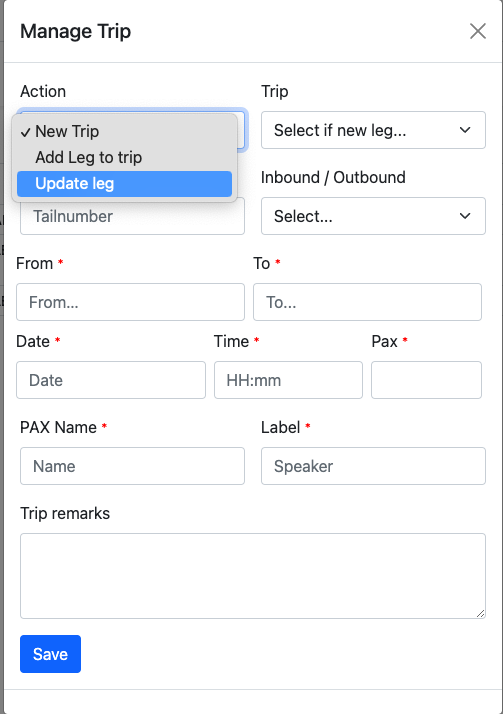 An existing leg can be updated by clicking on the Trip/Leg and select theUpdate Leg option from the action menu.