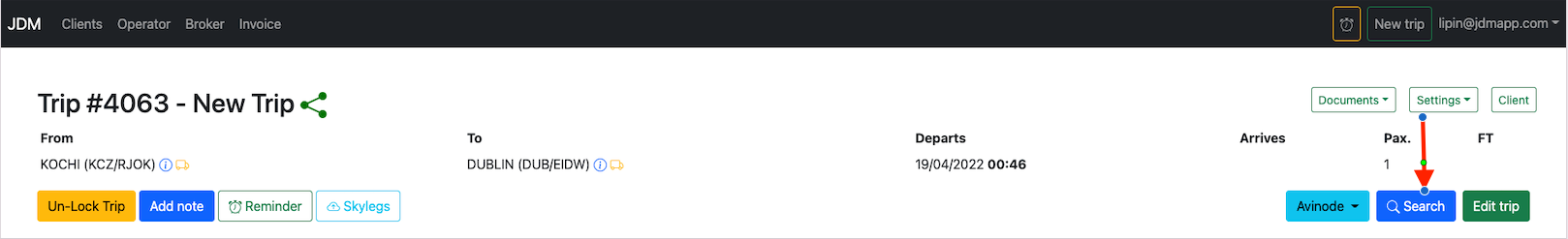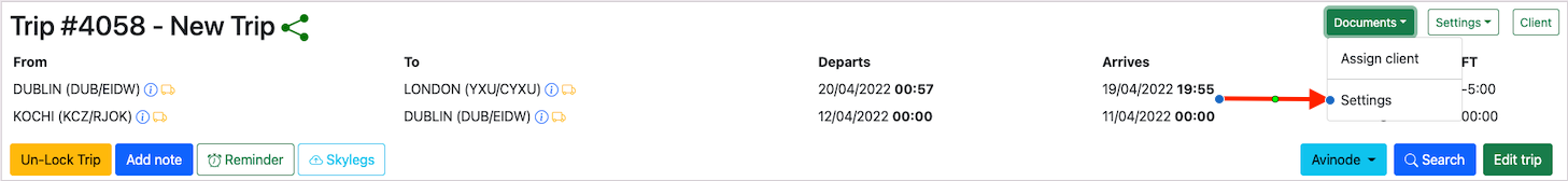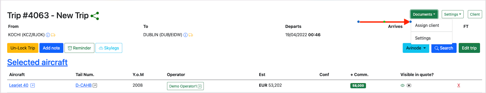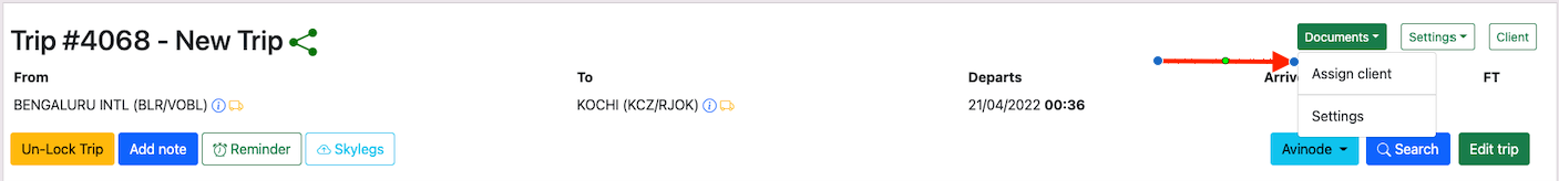 Once a trip has been created, then the next is to assign a client to the trip. Click on the Documentsbutton and selectAssign Clientto add a client to the trip.