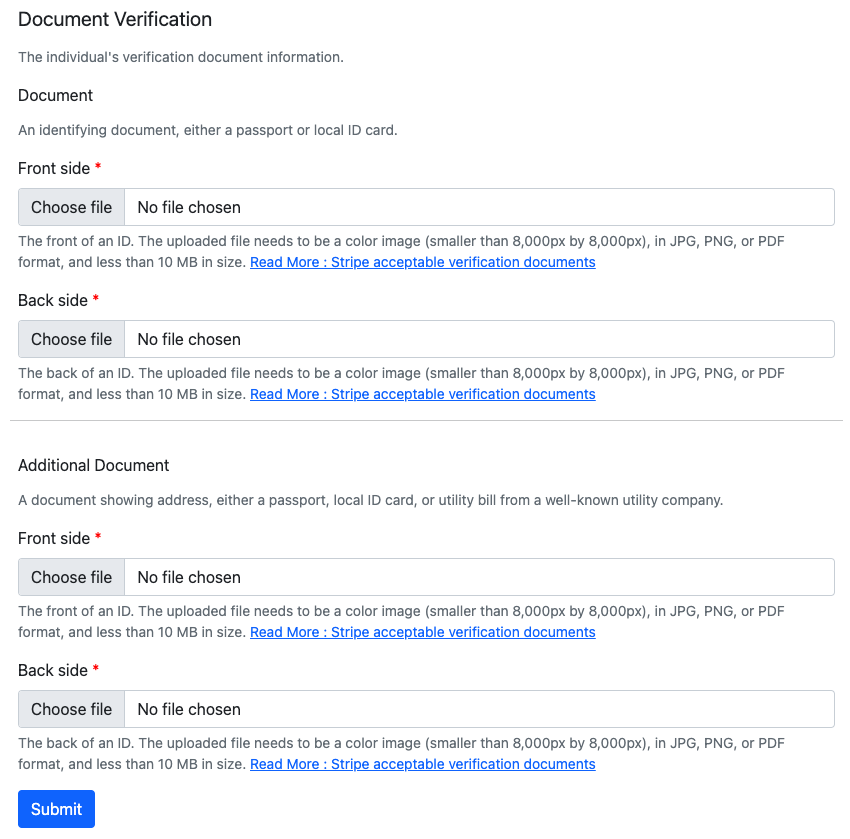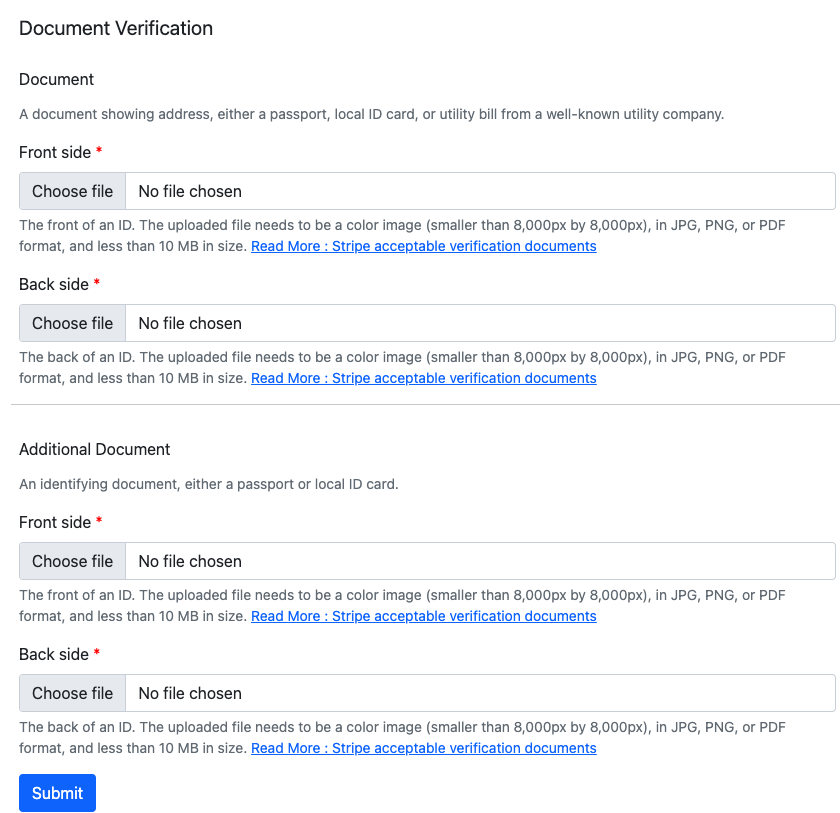 Upload all the requested documents in JPG, PNG or PDF format and the file size has to be a maximum of 10MB.