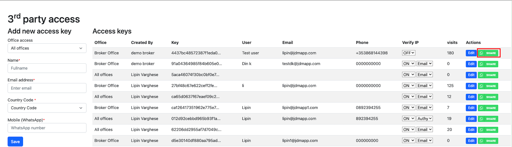 A registered user can share the access keys over whatsapp and an external person can create and manage trips on External Trips Dashboard. Click on the share button with the whatsapp icon on the right hand side.