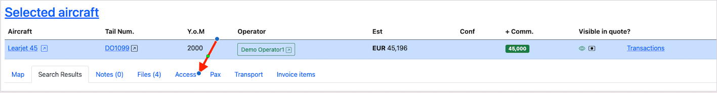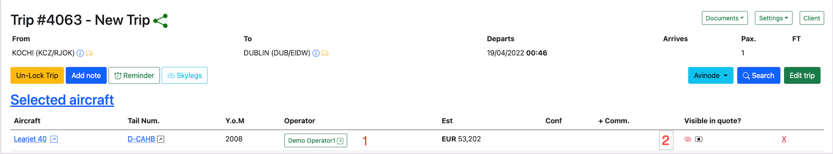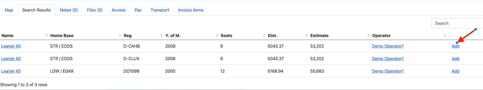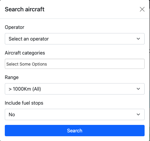 An aircraft is added to the trip by clicking on the Search button and selecting the corresponding type of aircraft.