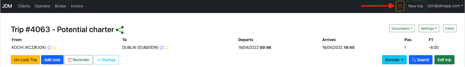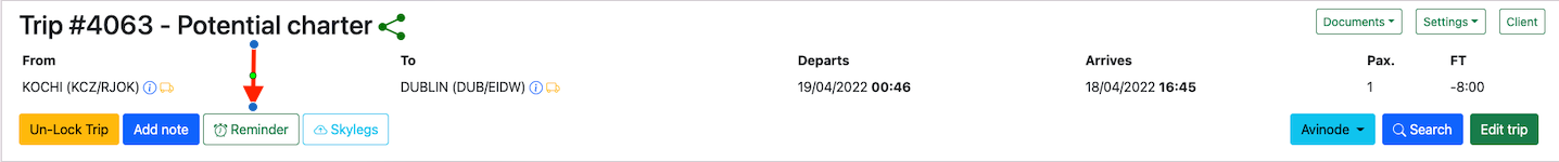 Reminders on trips are added by clicking on the Reminder button.