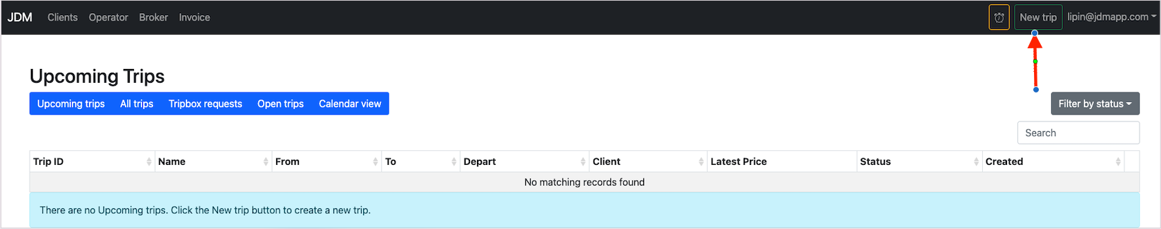 A new trip can be created by clicking on the New Trip button on the top right most corner.