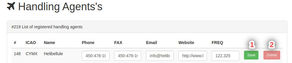 here your can edit / delete your hadling agents 1. after you change some details click this button to save and 2. you can delete some handling agents.